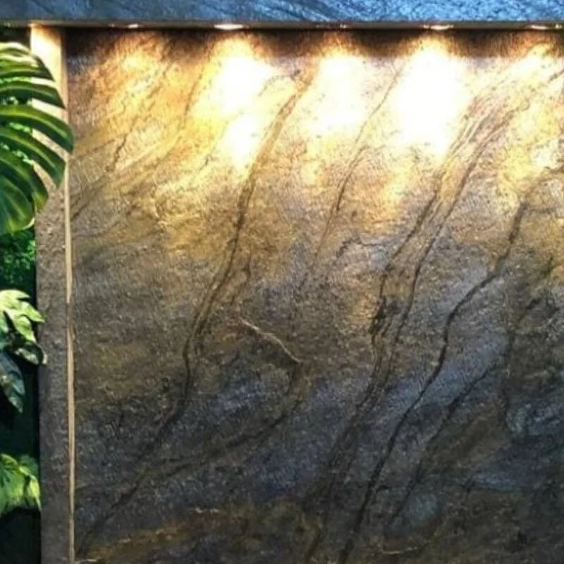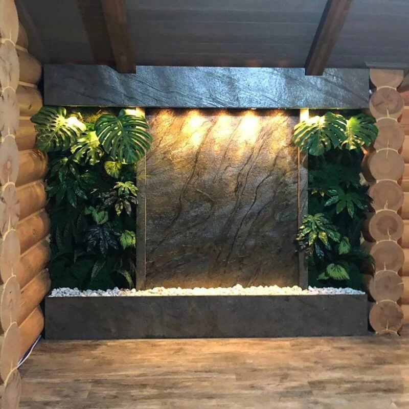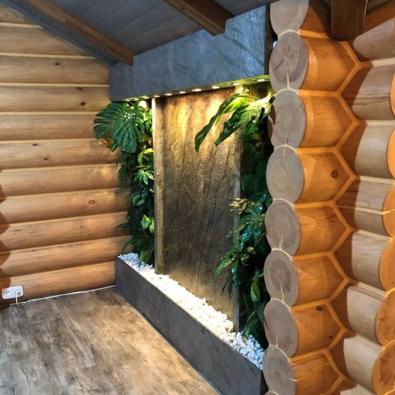 Для декора искусственного каменного водопада в частном особняке мы создали две фитостены из стабилизированного мха, монстеры и папоротника. Это выгодно подчеркнуло энергию воды и природы.