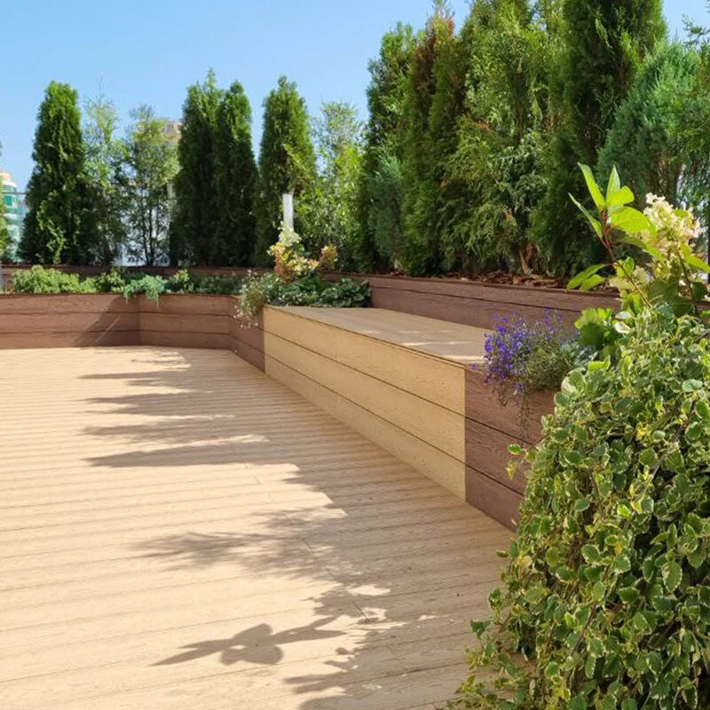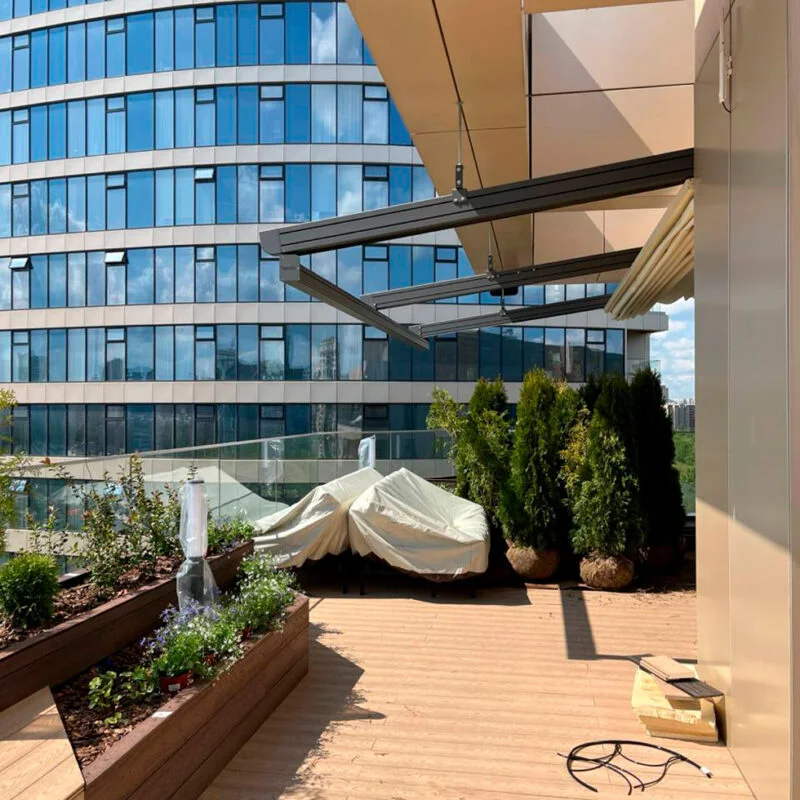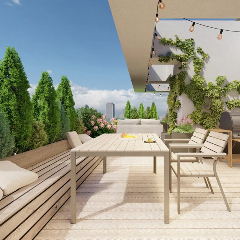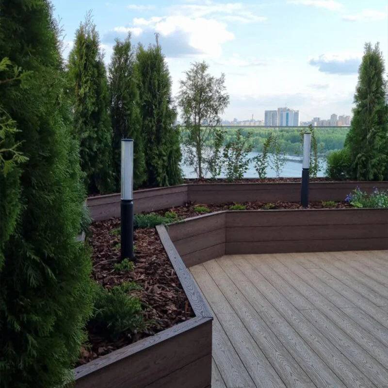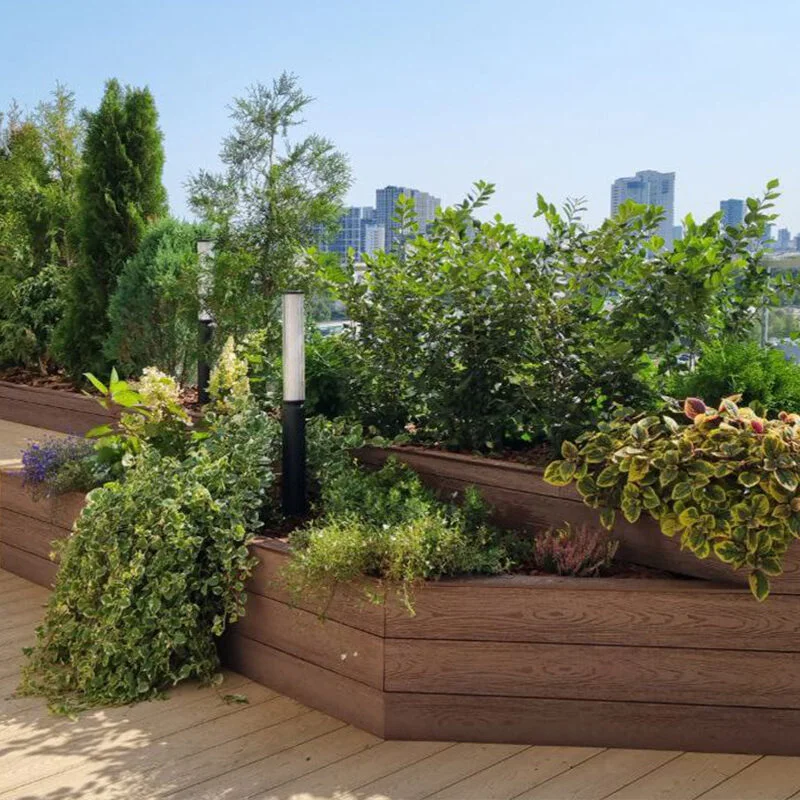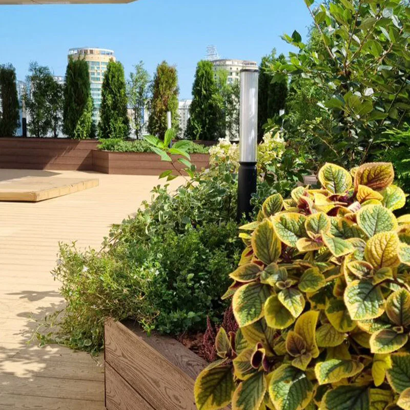 Живописный сад на террасе — уютный зелёный оазис с пышными туями в плетёных кашпо, изящным виноградом и яркими цветами. Идеальное место для отдыха в гармонии с природой.