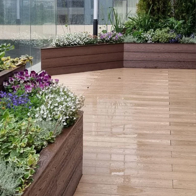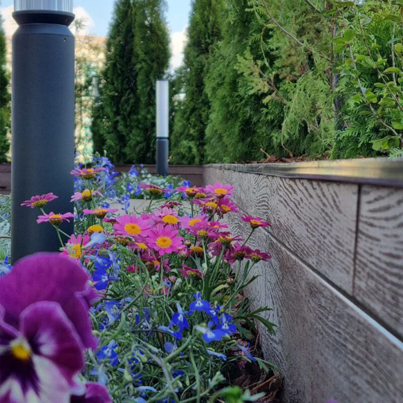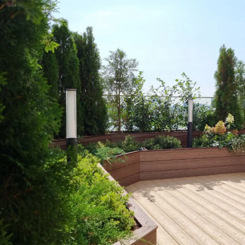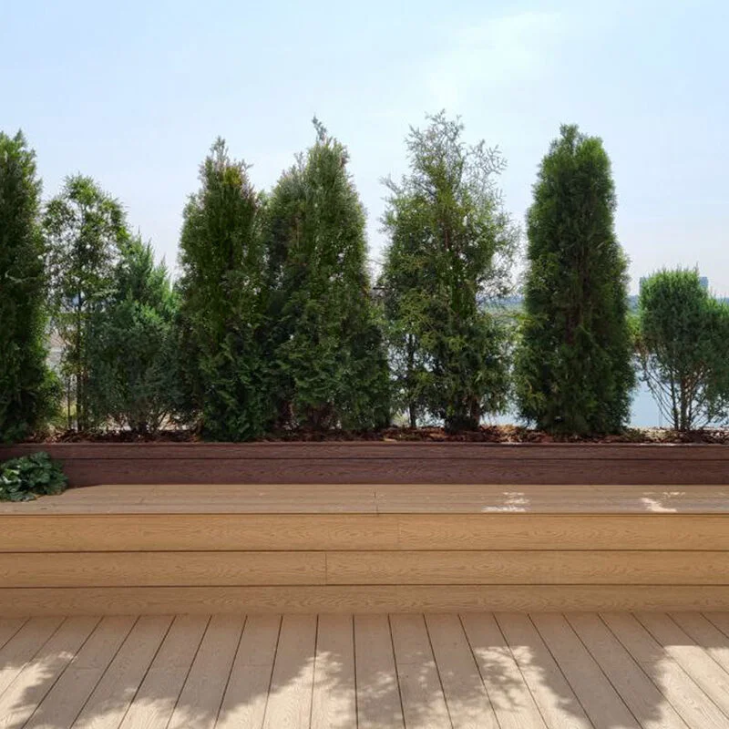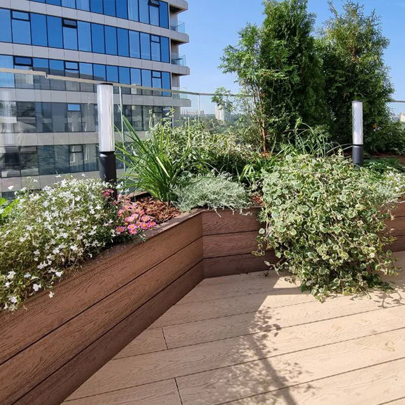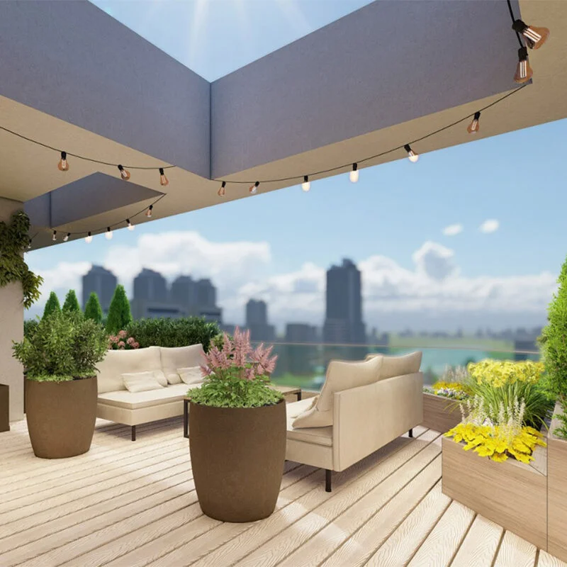 Живописный сад на террасе — уютный зелёный оазис с пышными туями в плетёных кашпо, изящным виноградом и яркими цветами. Идеальное место для отдыха в гармонии с природой.