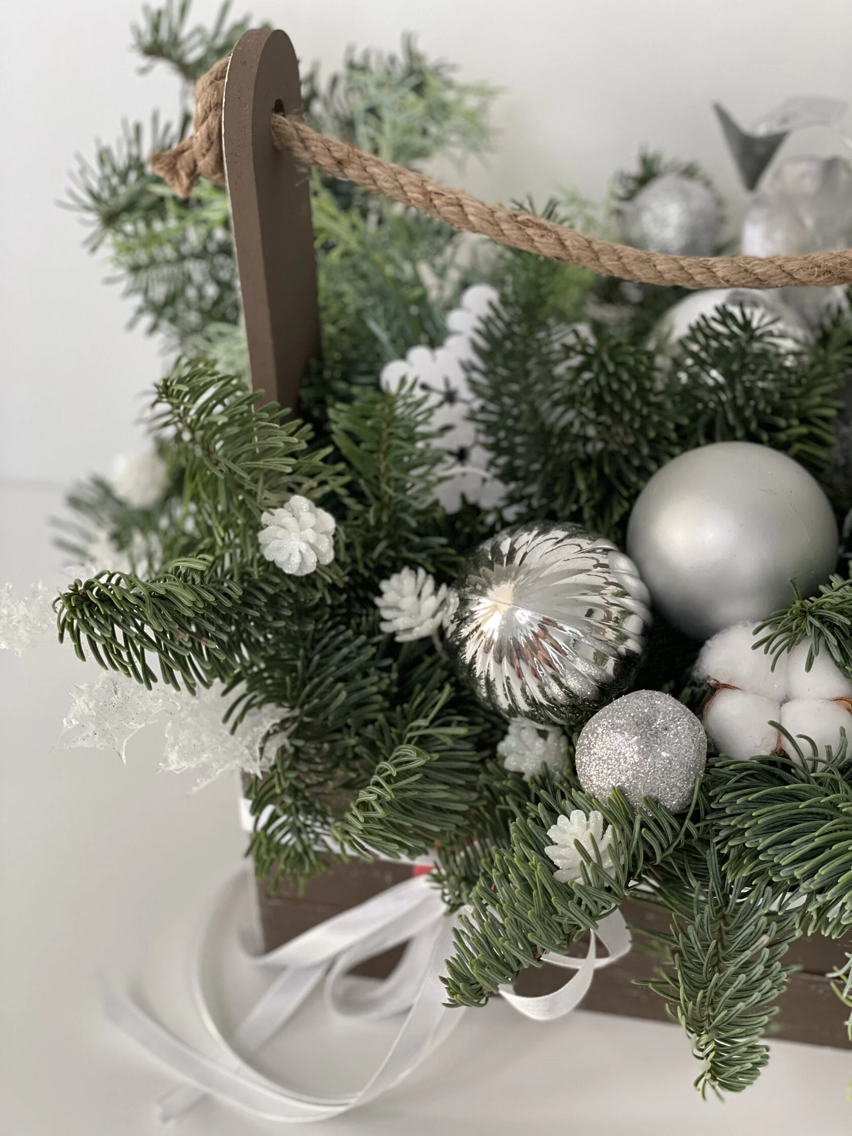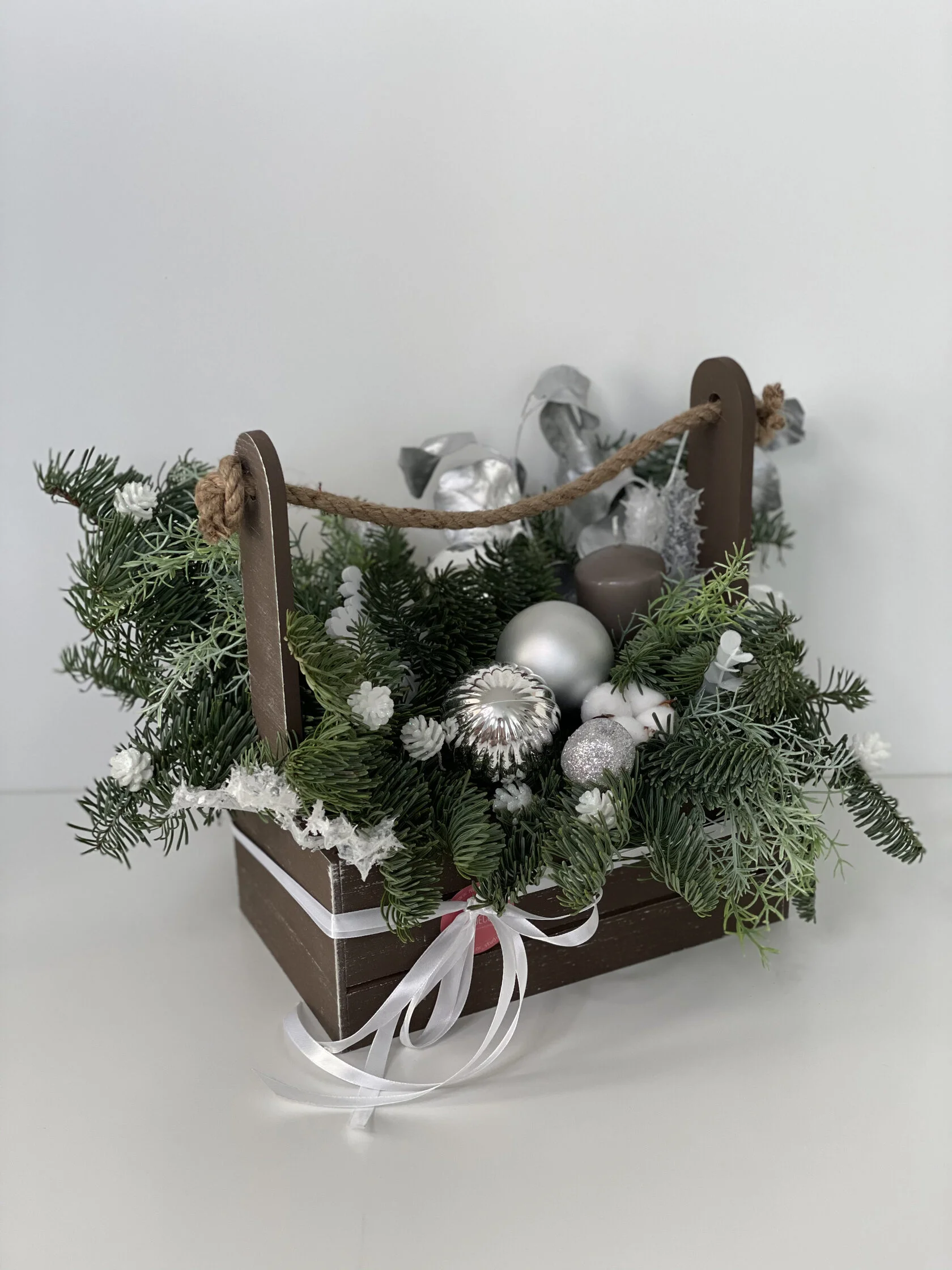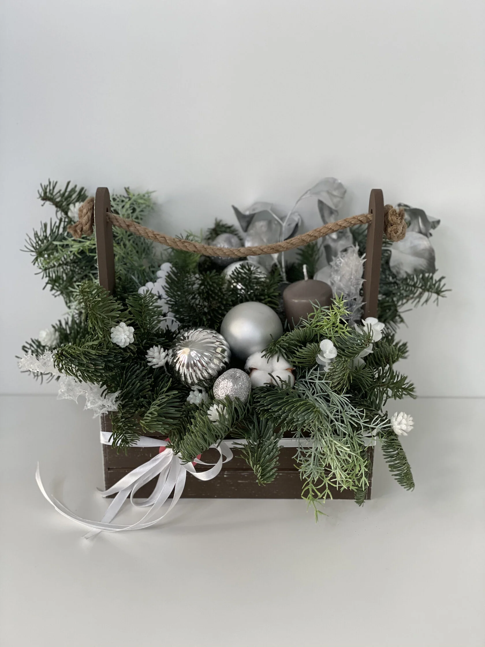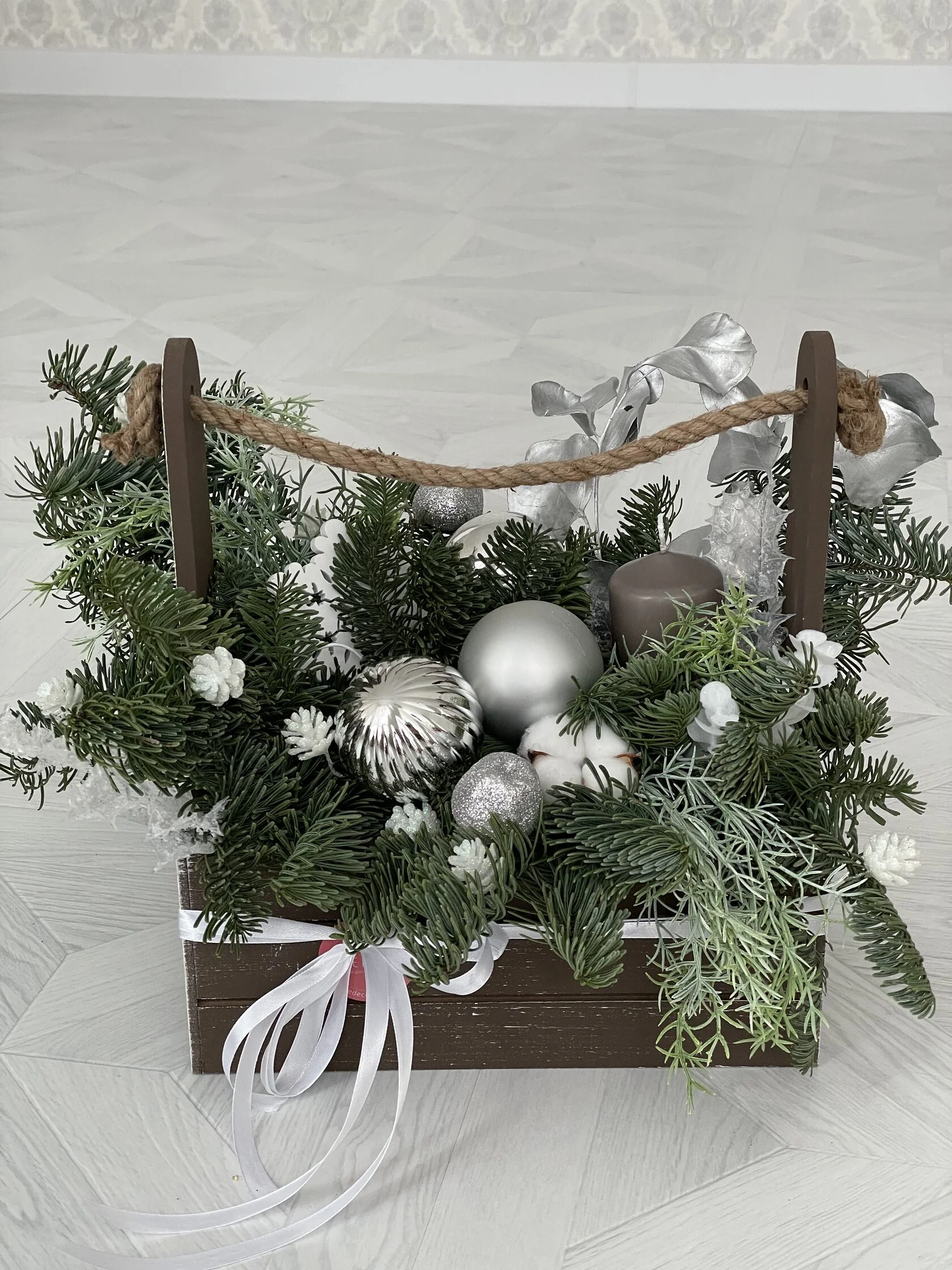 Композиция, созданная из ароматного датского лапника. Украшенная серебряными шарами, хлопком, свечой и веточками. Помещена в деревянное кашпо.