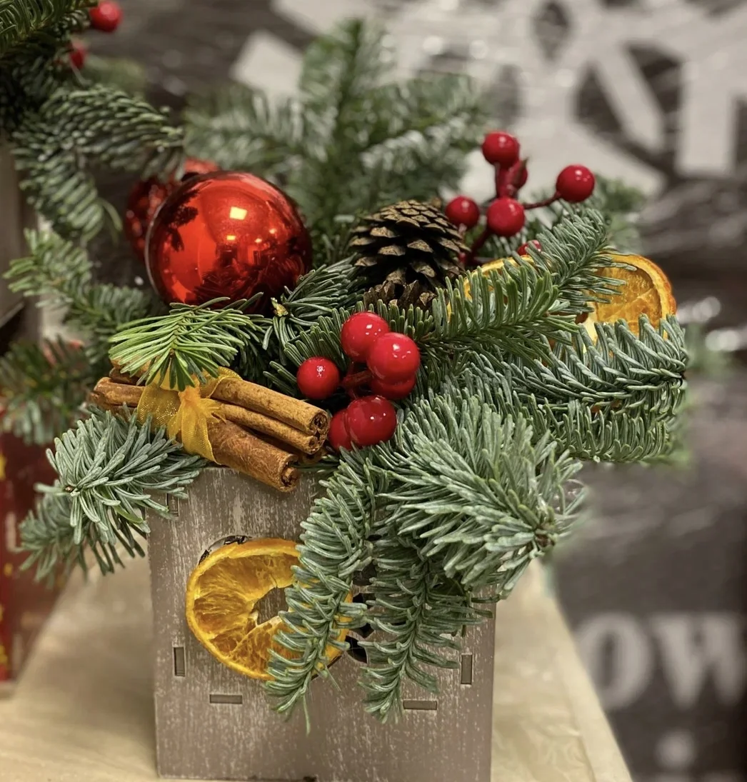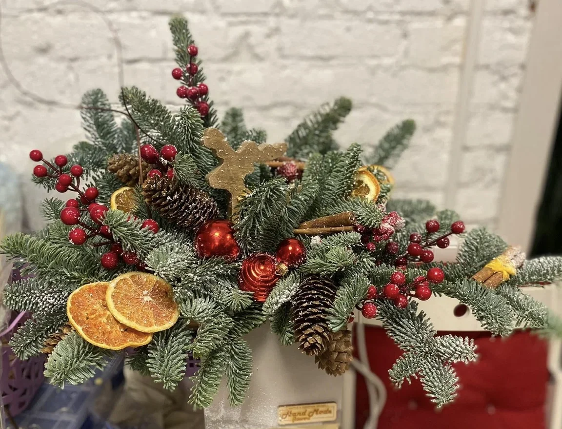 Рождественская композиция, созданная из свежих еловых ветвей, украшена яркими элементами. В декоре использованы красные ягоды, шишки, апельсиновые дольки и палочки корицы. Финальные штрихи добавляют блестящие шары и фигурка оленя, создавая атмосферу праздника.