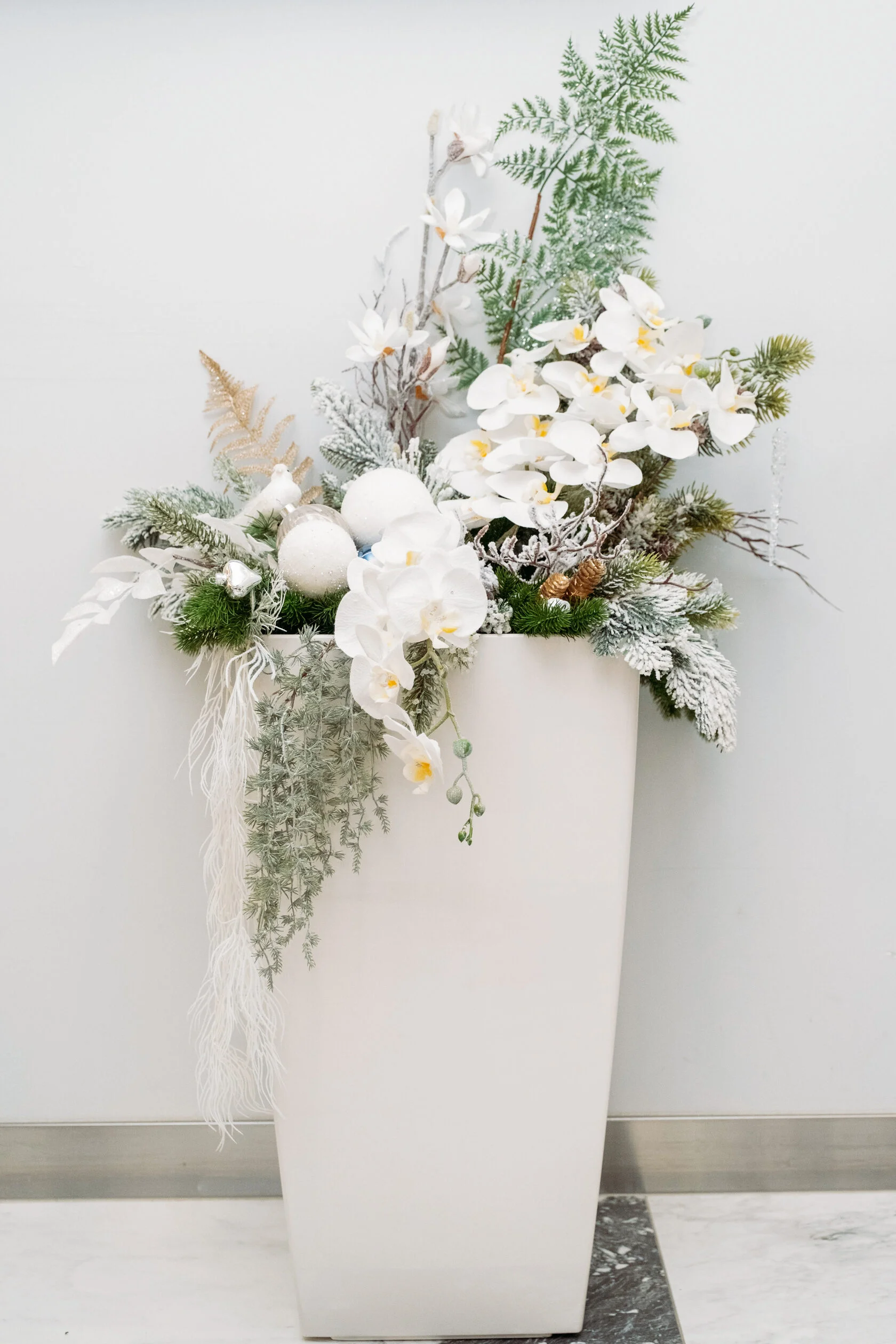Изящная белая ваза, украшенная искусственными растениями и цветами, привлекает внимание. В ней гармонично сочетаются белоснежные орхидеи, зелёные ветви и элементы, похожие на заснеженные еловые лапы. Завершают композицию декоративные белые шары и другие детали, создающие атмосферу зимнего праздника или Нового года.