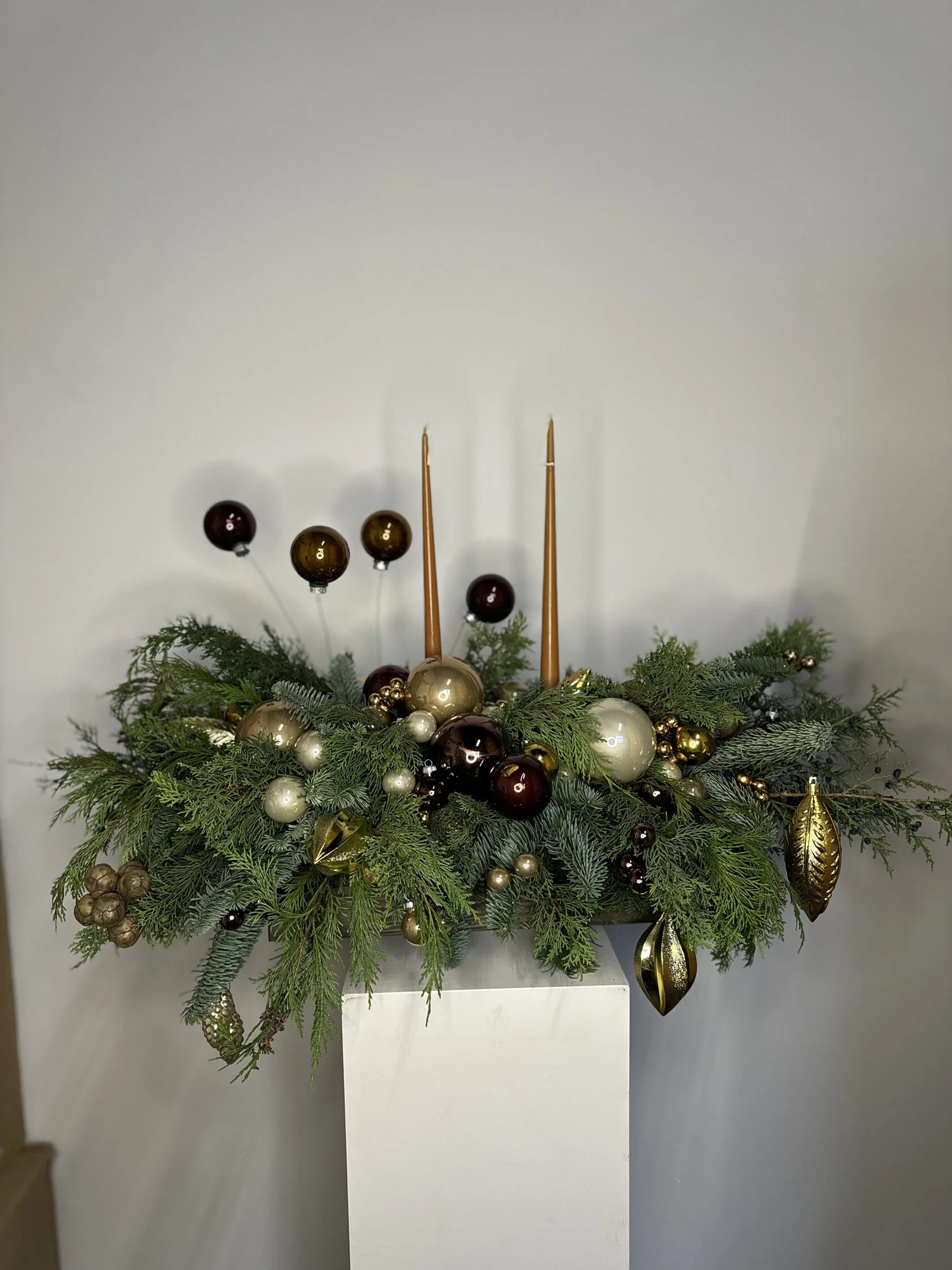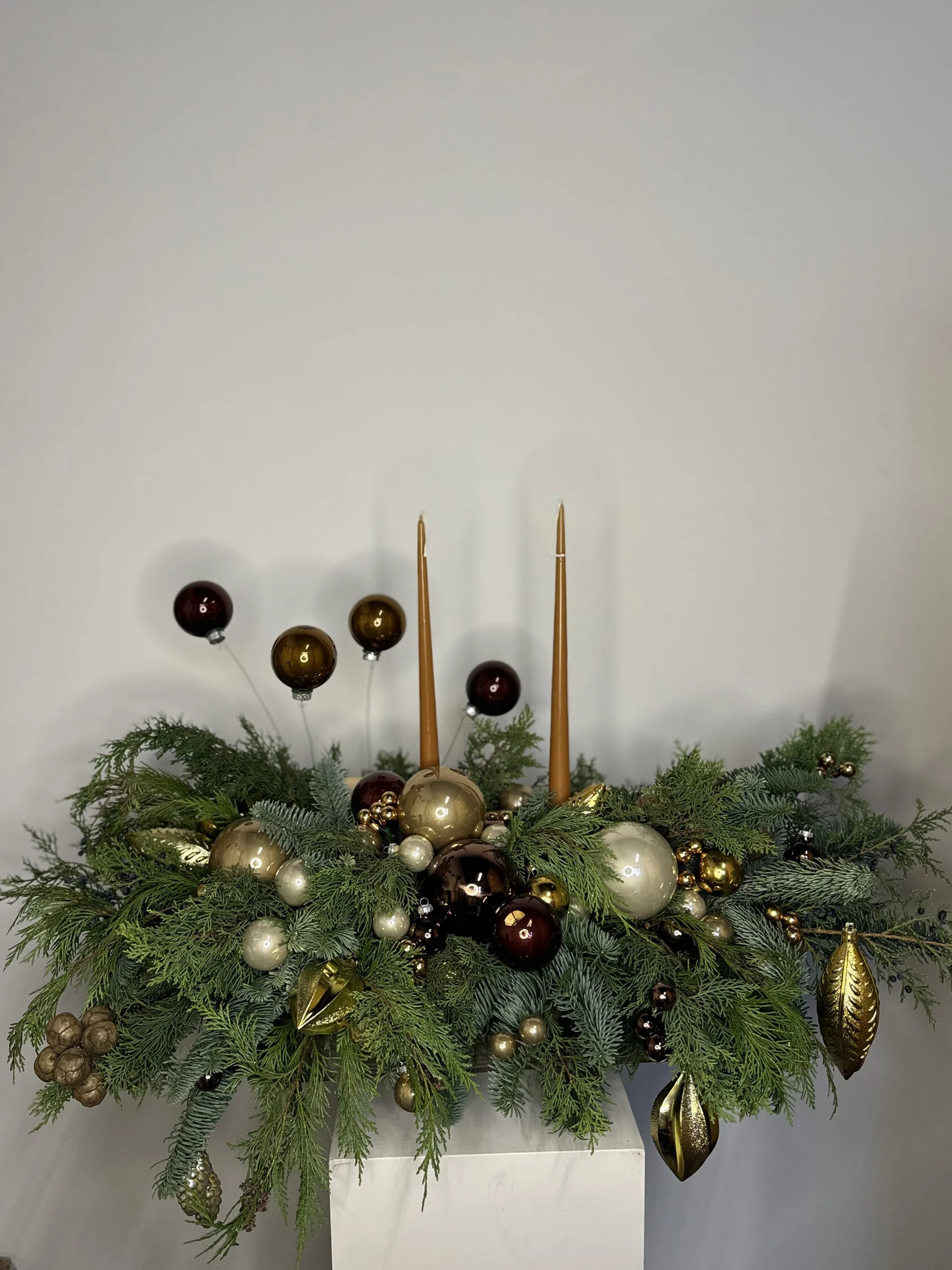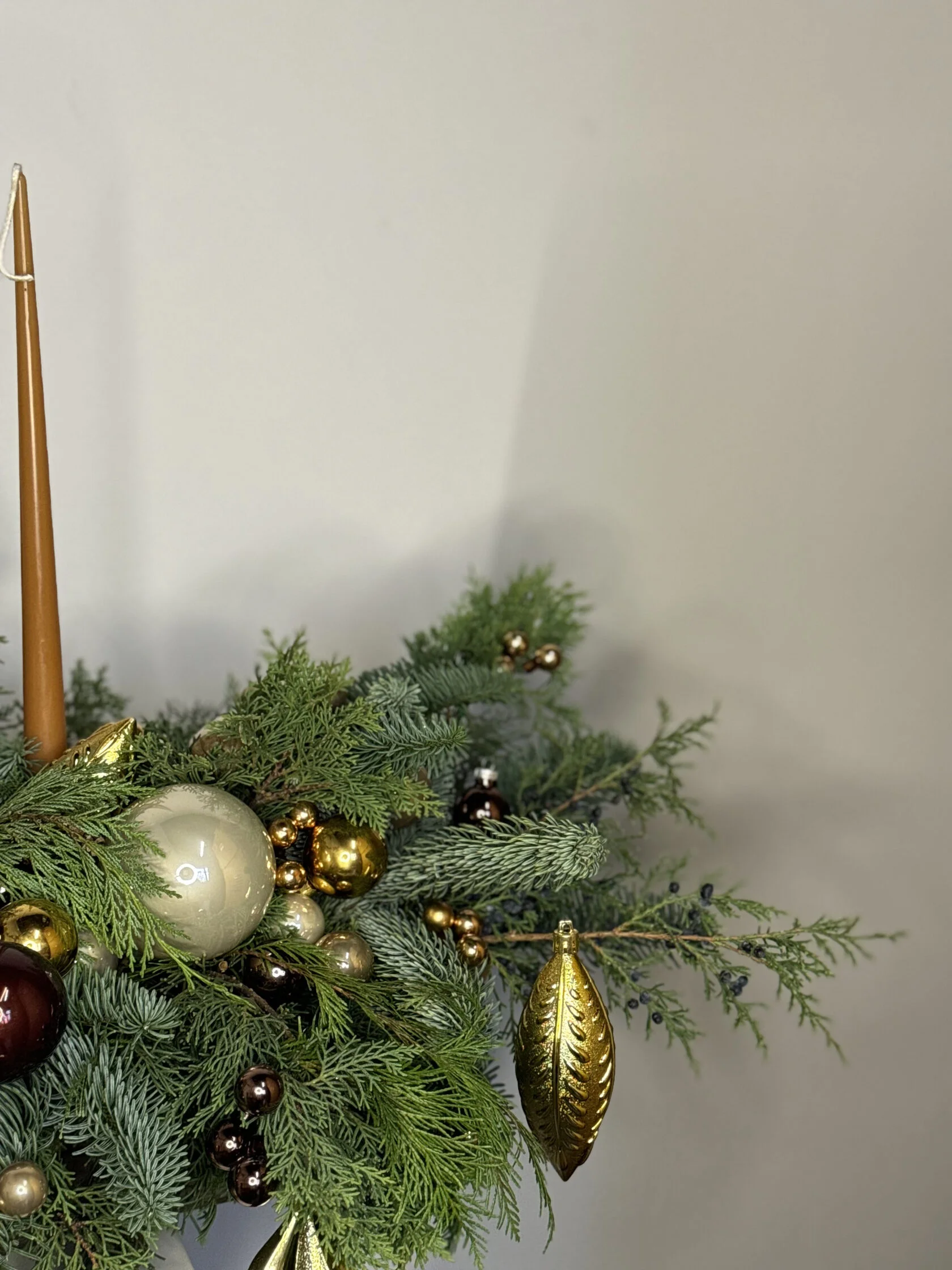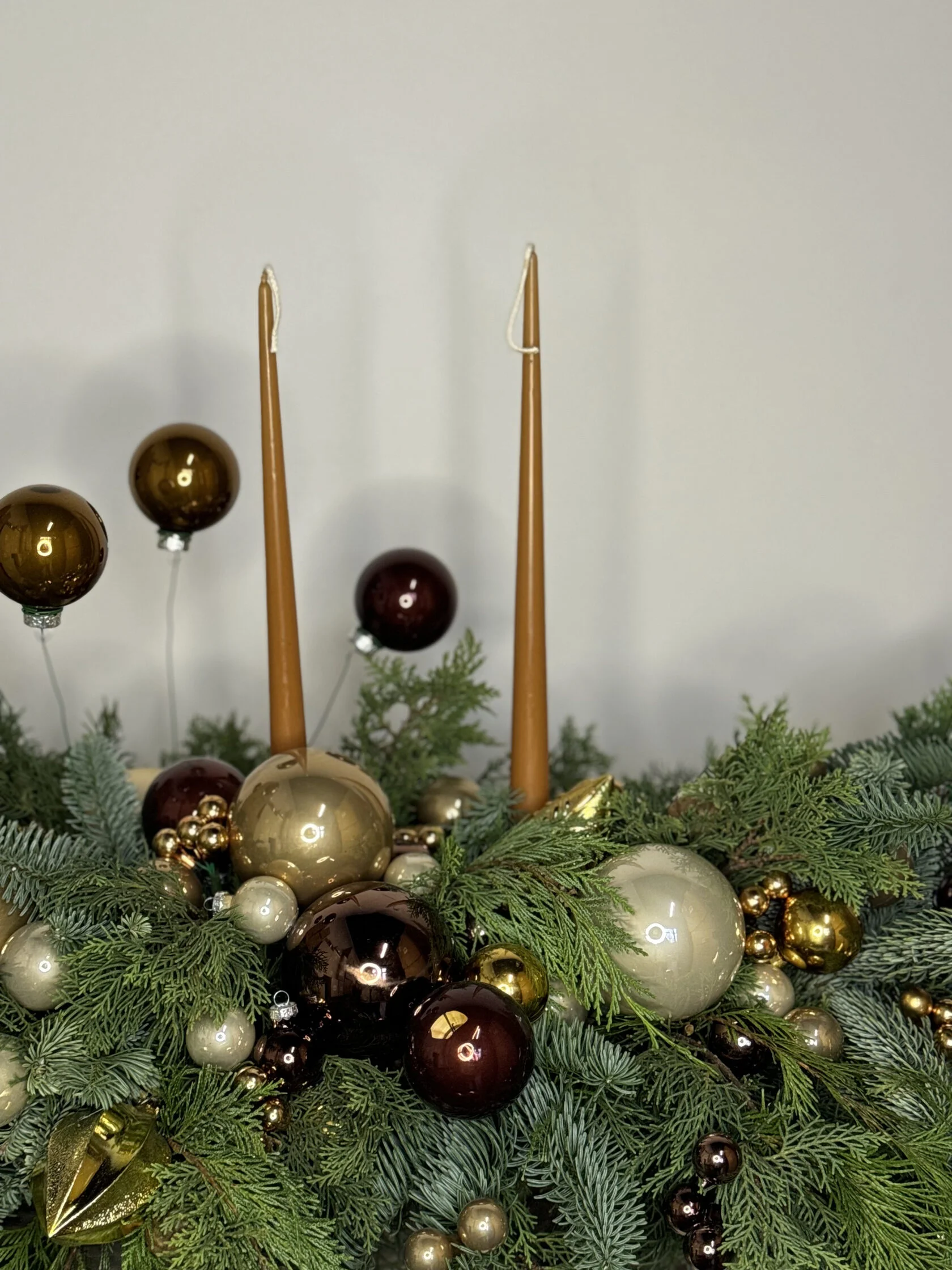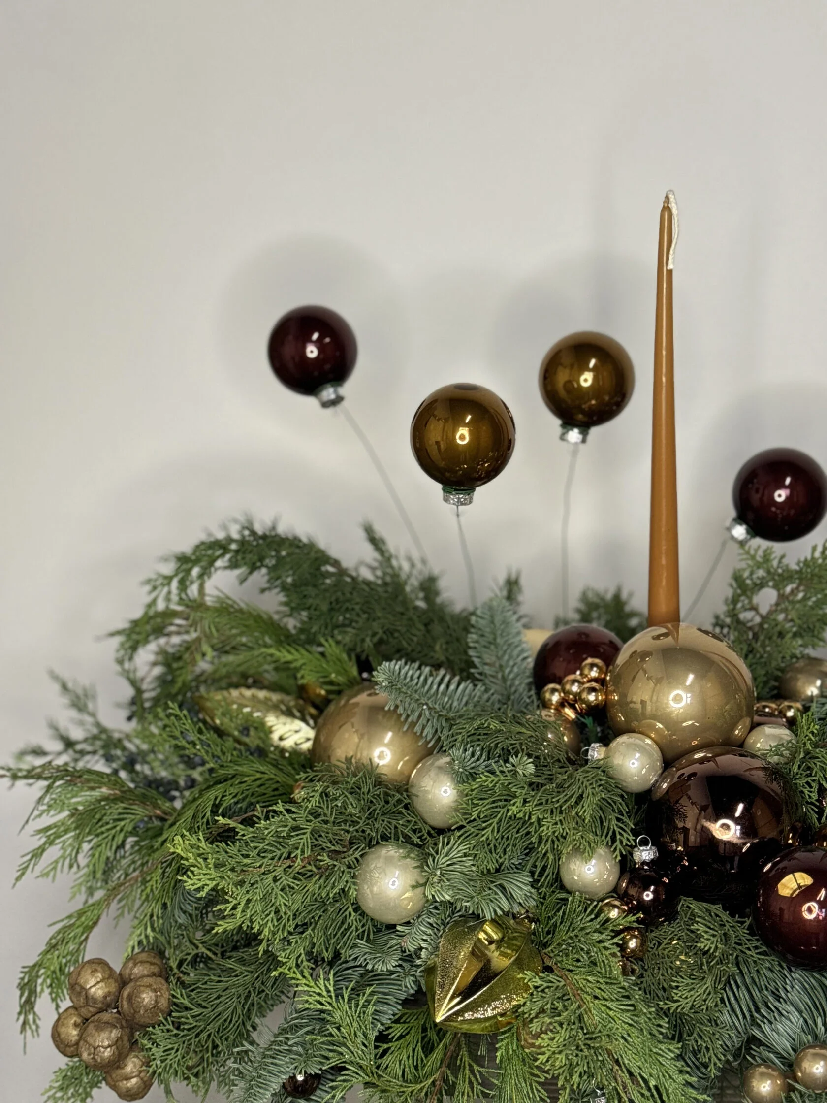 Композиция из свежей хвои украшена золотыми шарами разного размера, шарами-сосульками и коричневыми шарами-фейерверками. В центре — две золотые свечи. Завершает композицию деревянное кашпо.