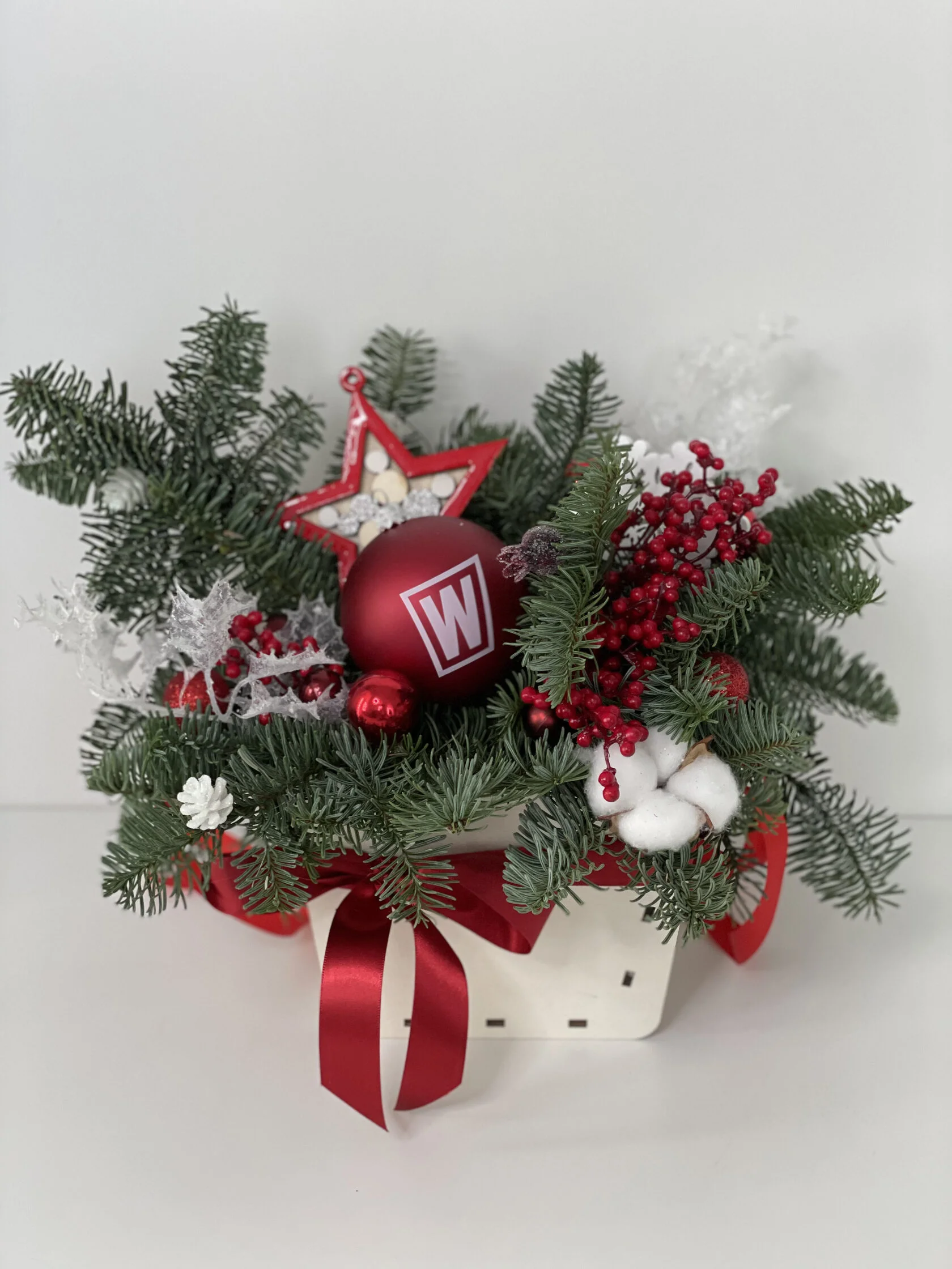 Композиция из ароматного датского лапника. Украшение из красных шаров, хлопка, ягод, веточек и звезды. Деревянное кашпо.