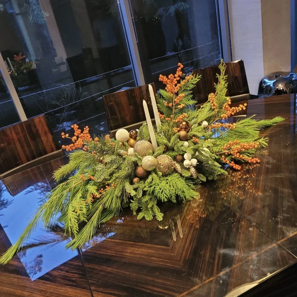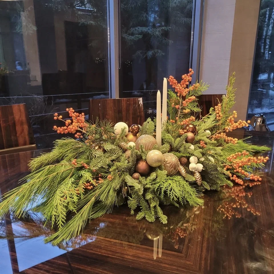 Изысканная композиция из элитных веток хвойных деревьев, украшенная яркими оранжевыми ягодами, сверкающими золотистыми и белоснежными шарами. В центре композиции возвышаются две белоснежные свечи, создавая атмосферу уюта и тепла.