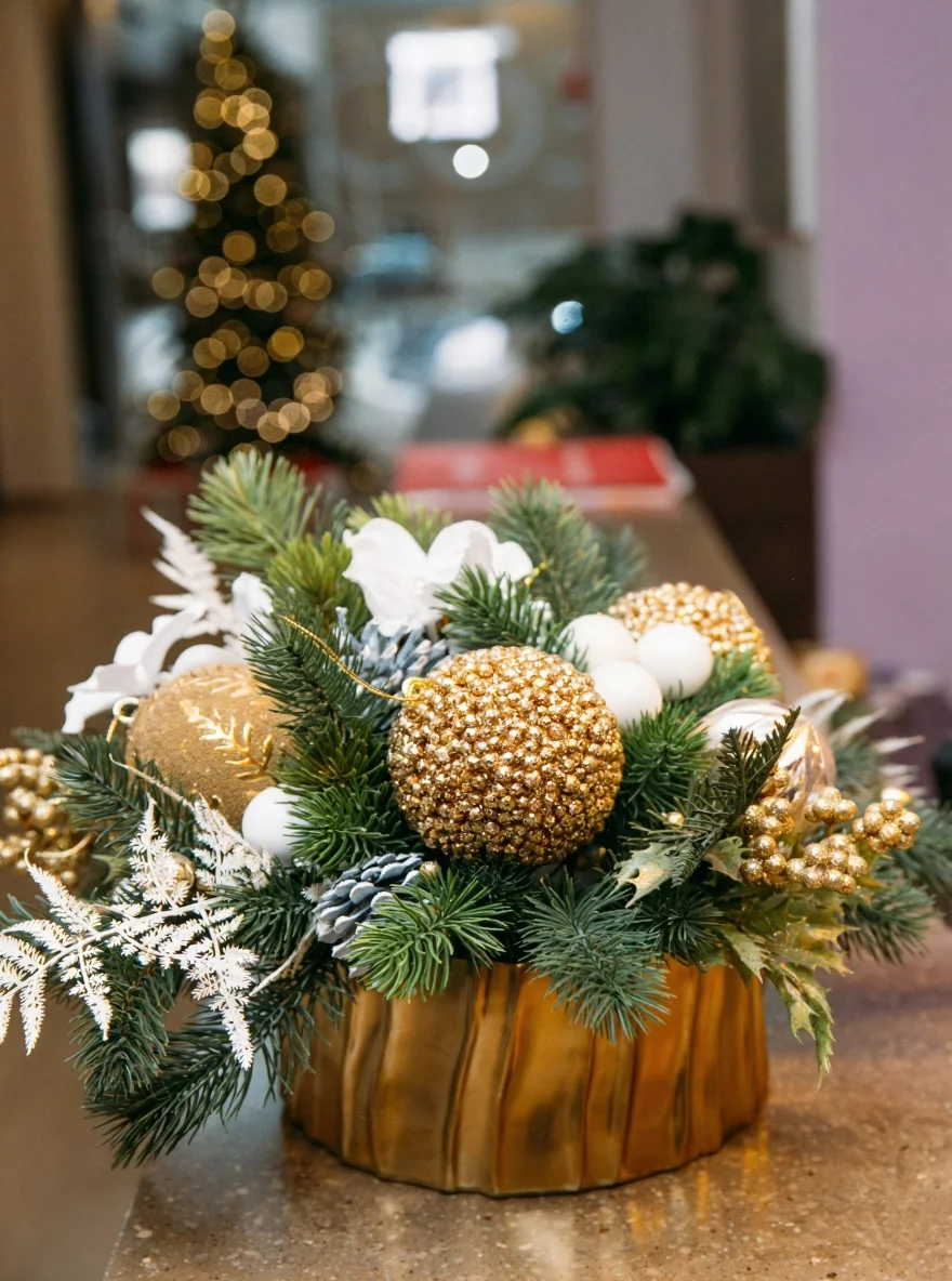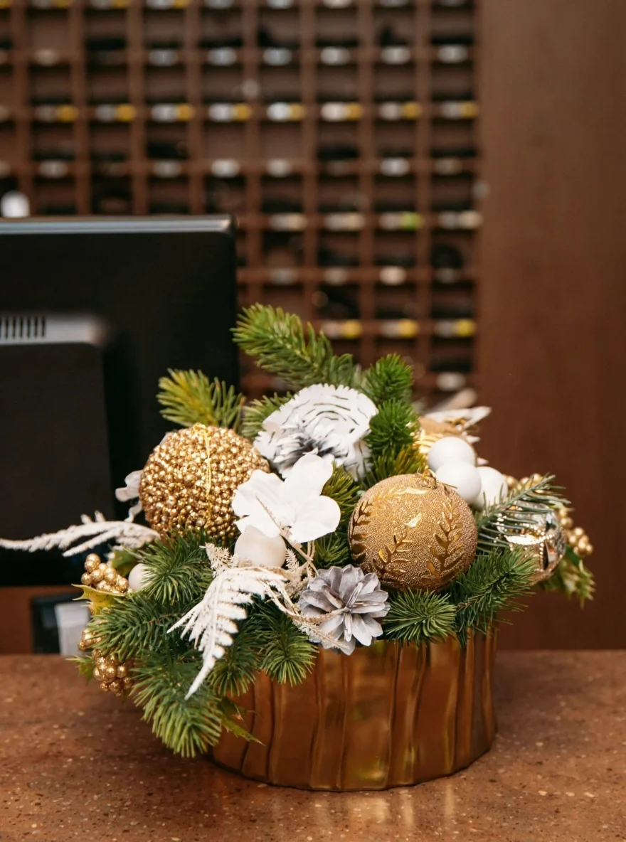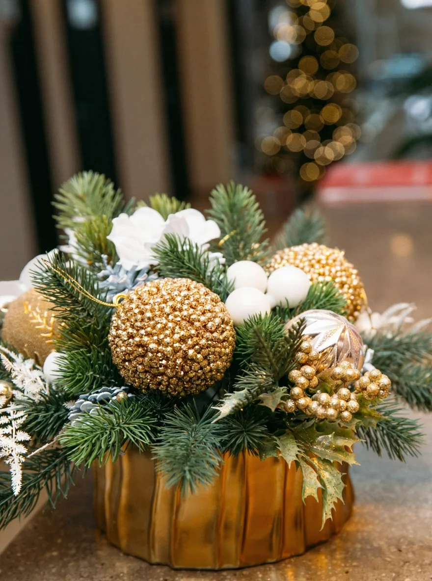 Композиция из искусственной хвои высшего качества. Декор с золотыми шарами, веточками и украшениями. Золотое керамическое кашпо.