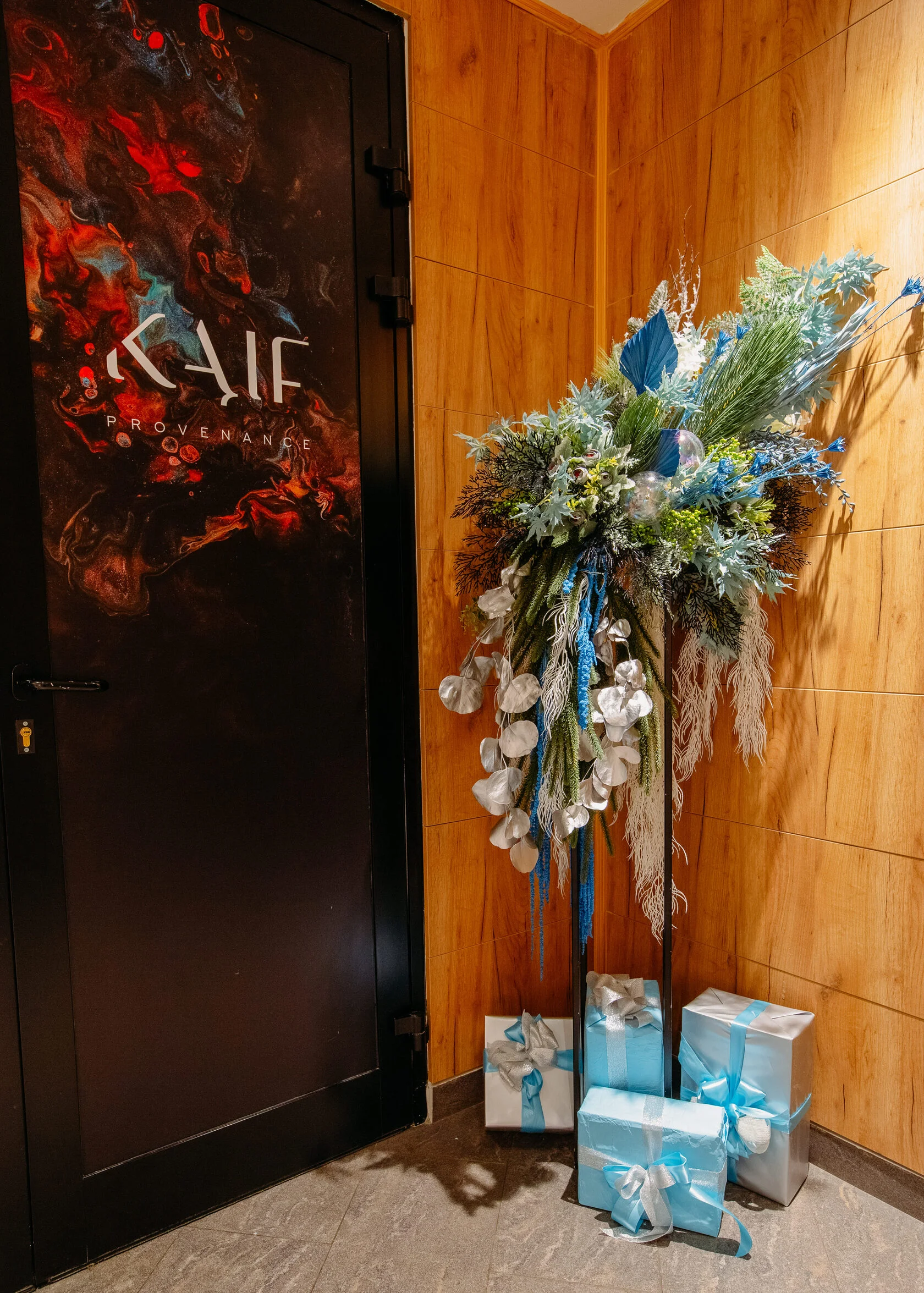 Элегантная цветочная композиция в сине-зеленых тонах. Разнообразие растений и цветов гармонично сочетается с серебристыми акцентами. Три подарочные коробки, обернутые в голубую и серебристую бумагу, украшены нежными голубыми лентами.