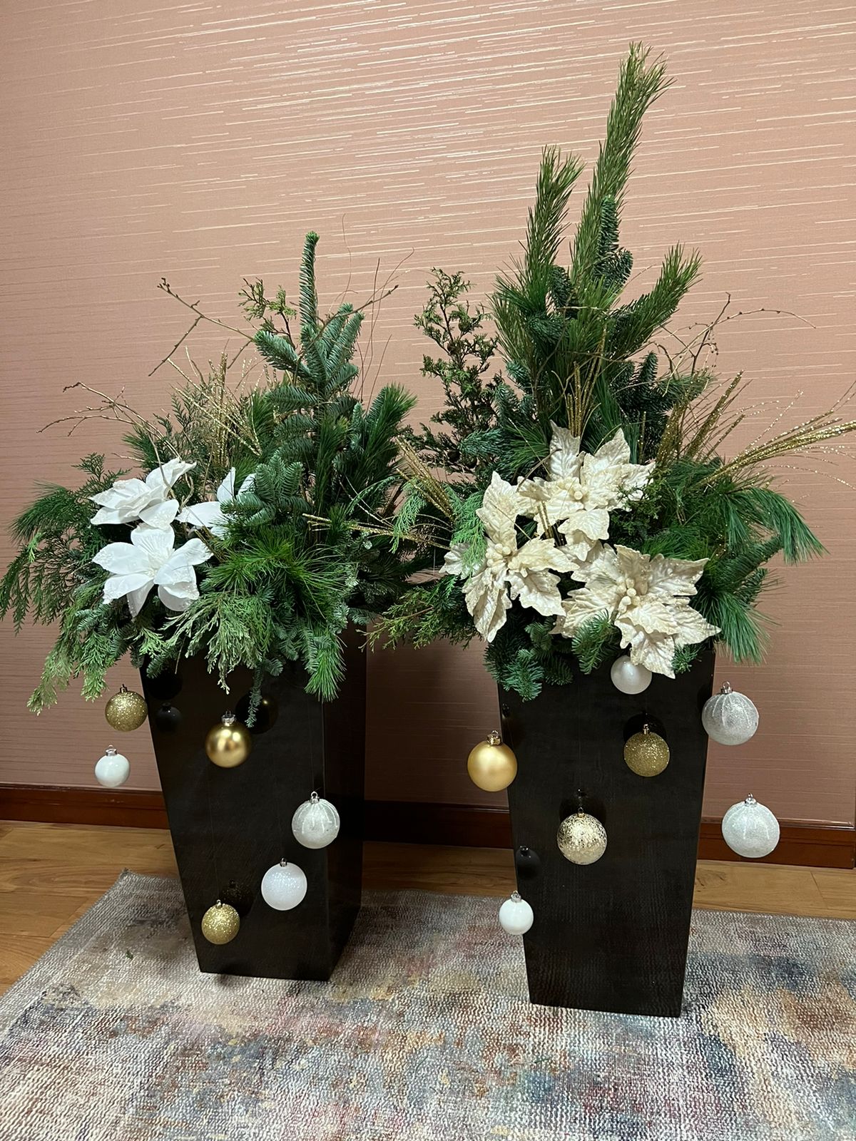 Композиции из еловых и сосновых веток, украшенные декоративными элементами. Ветви изящно декорированы белыми и золотистыми цветками, напоминающими пуансеттию. На изящных кашпо развешаны новогодние шары разных оттенков: белые, золотые и серебристые.