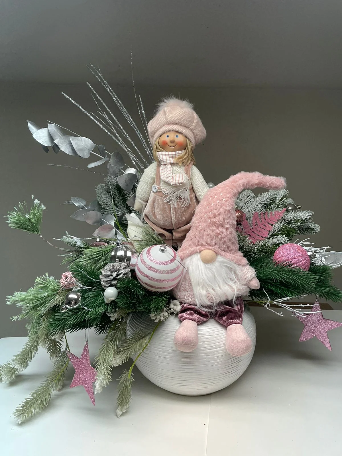 Элегантная композиция из искусственной хвои премиум-класса с эффектом заснеженности. Украшена розовыми и золотыми шарами, звёздами, шишками, веточками и новогодними фигурками. Помещена в стильное белое керамическое кашпо.