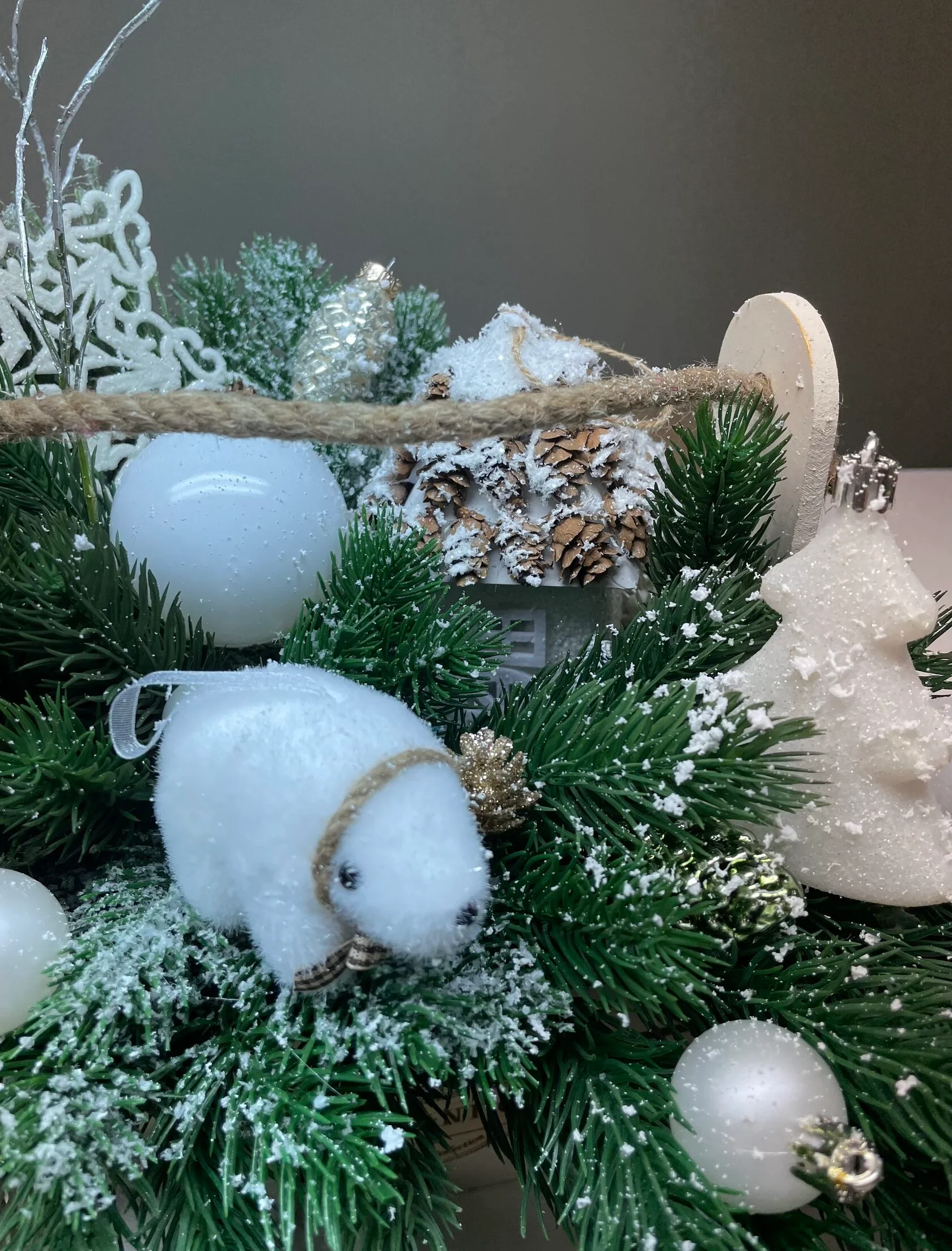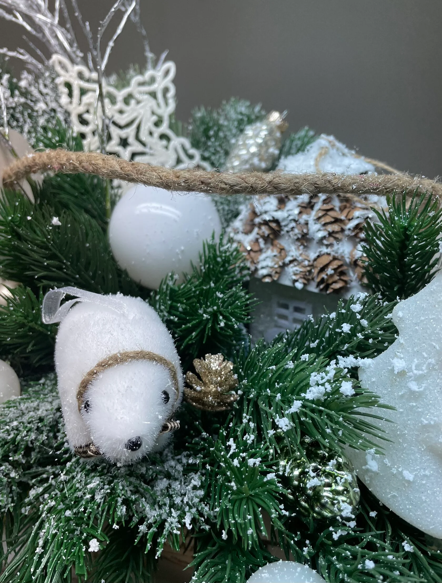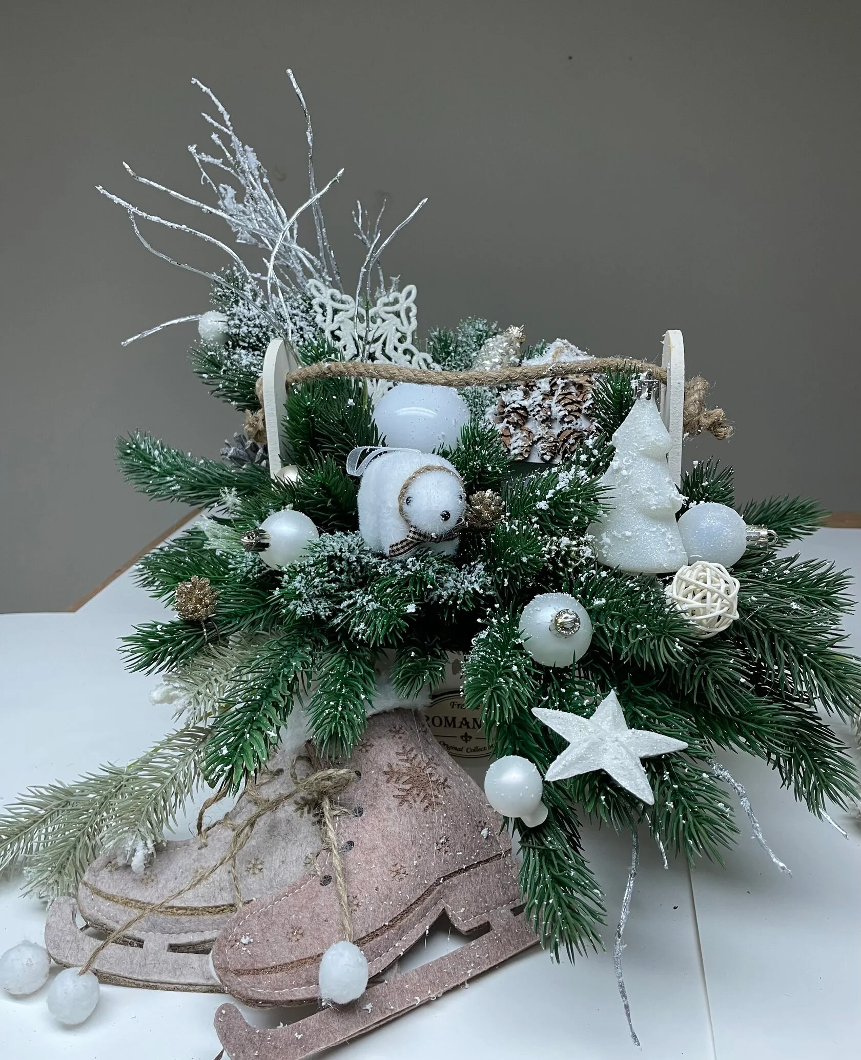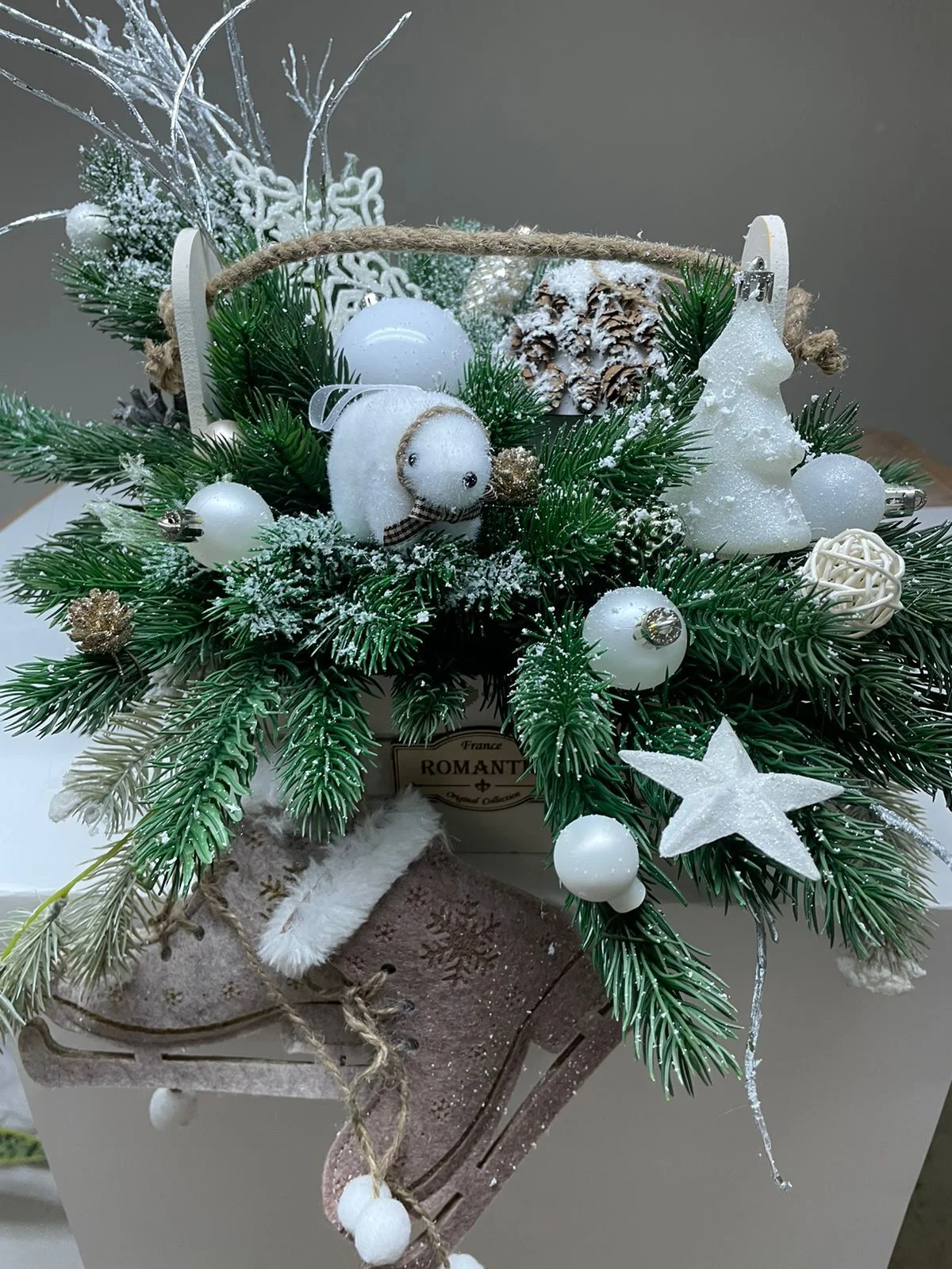 В корзине установлена новогодняя композиция. Ветки ели украшены искусственным снегом, белыми шарами и фигурками — среди них есть елочка и медвежонок. Также присутствуют шишки, присыпанные снегом, белая звезда и плетеный шар. Основу композиции составляют декоративные коньки.