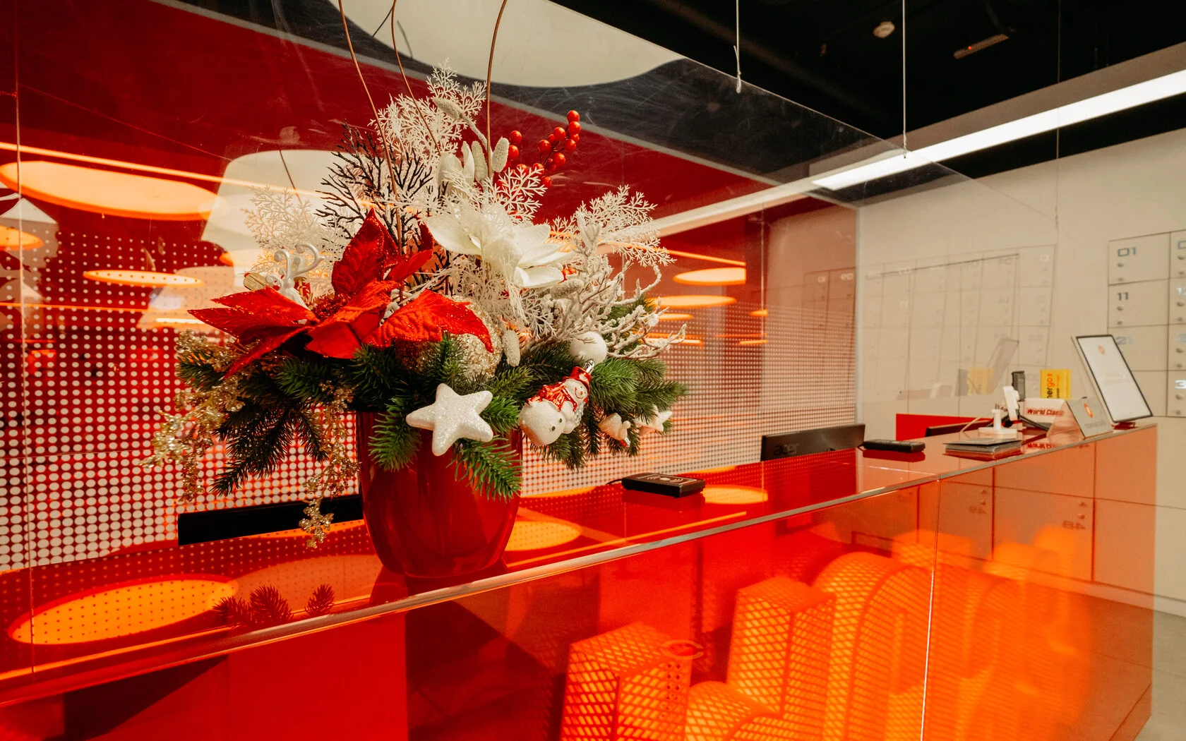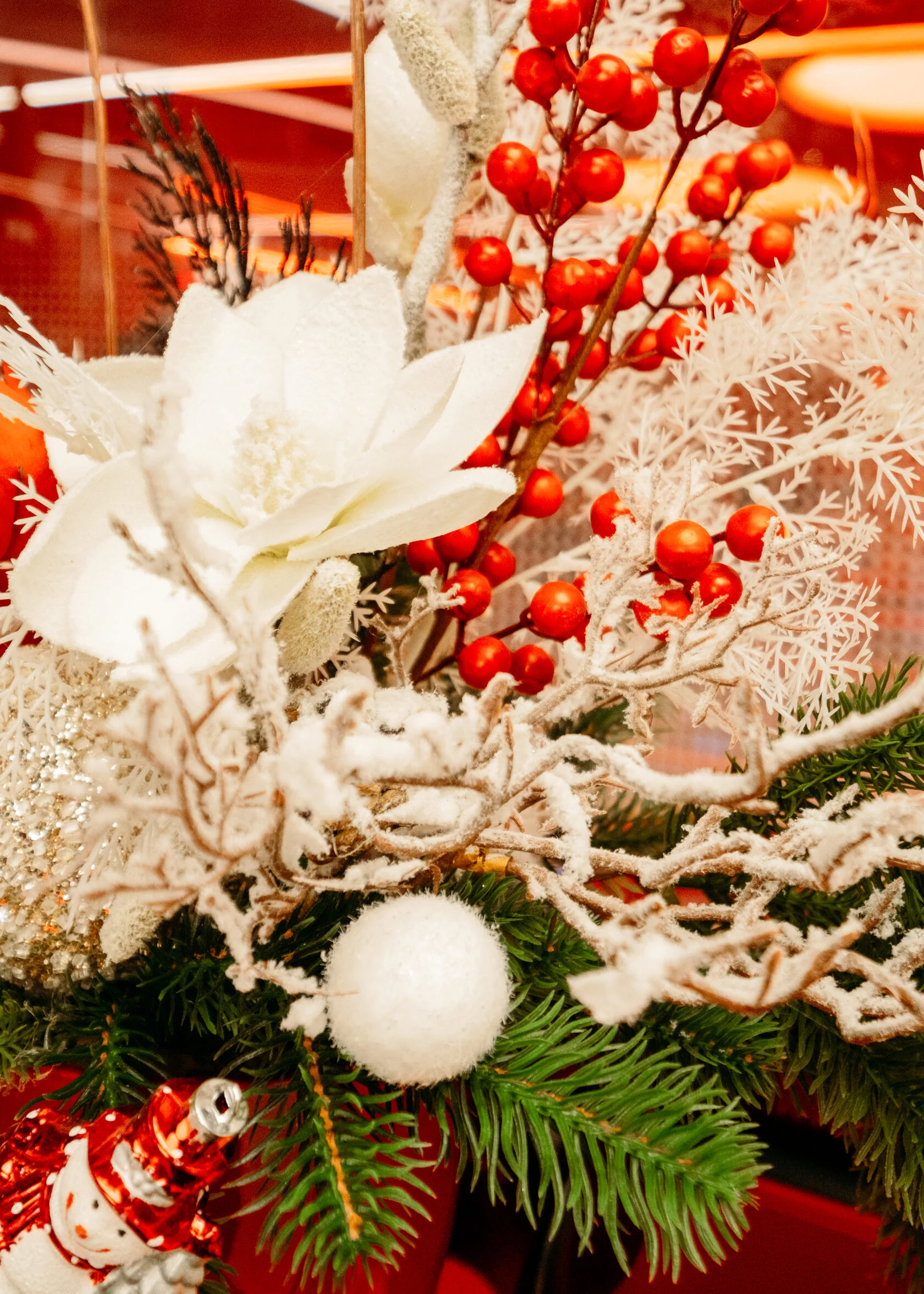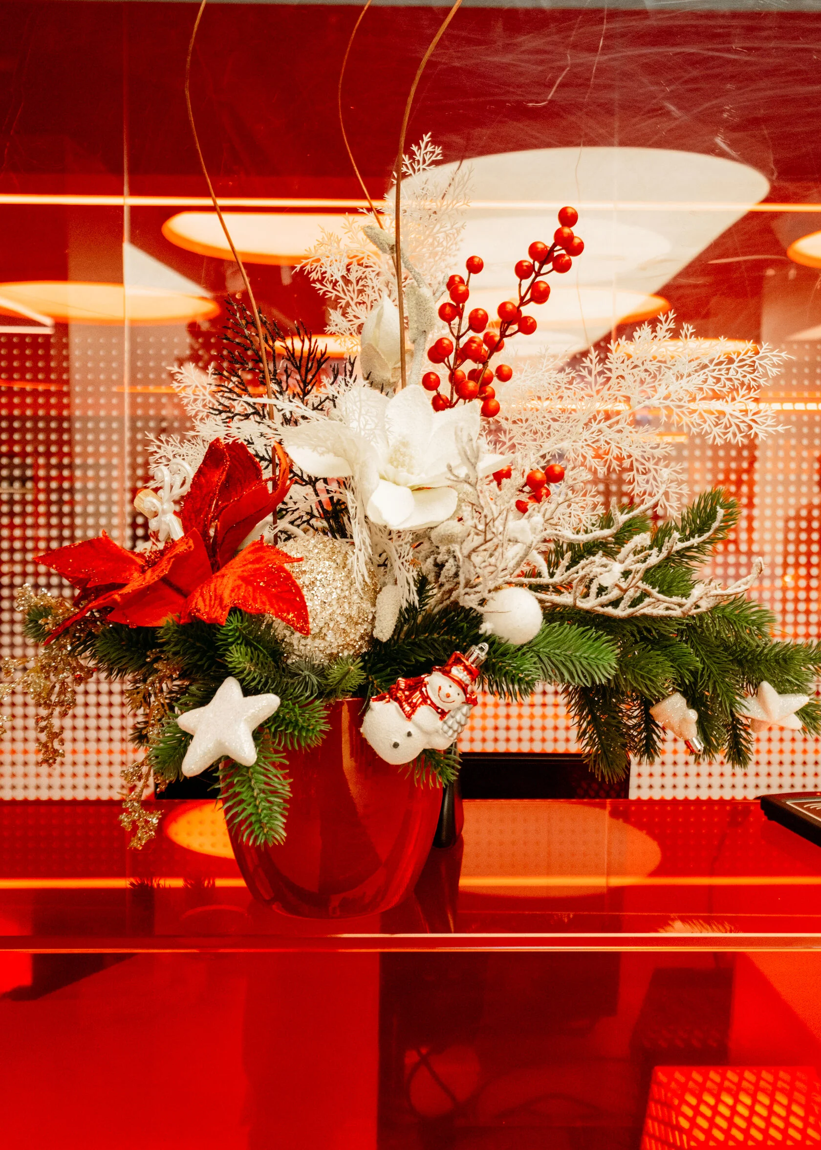 В красной вазе возвышается живая ель, украшенная разнообразными декоративными элементами. Среди них — белые и красные цветы, блестящие золотистые шары. Веточки с яркими красными ягодами гармонично сочетаются с белыми снежинками. Завершают композицию белая звезда и фигурка снеговика.