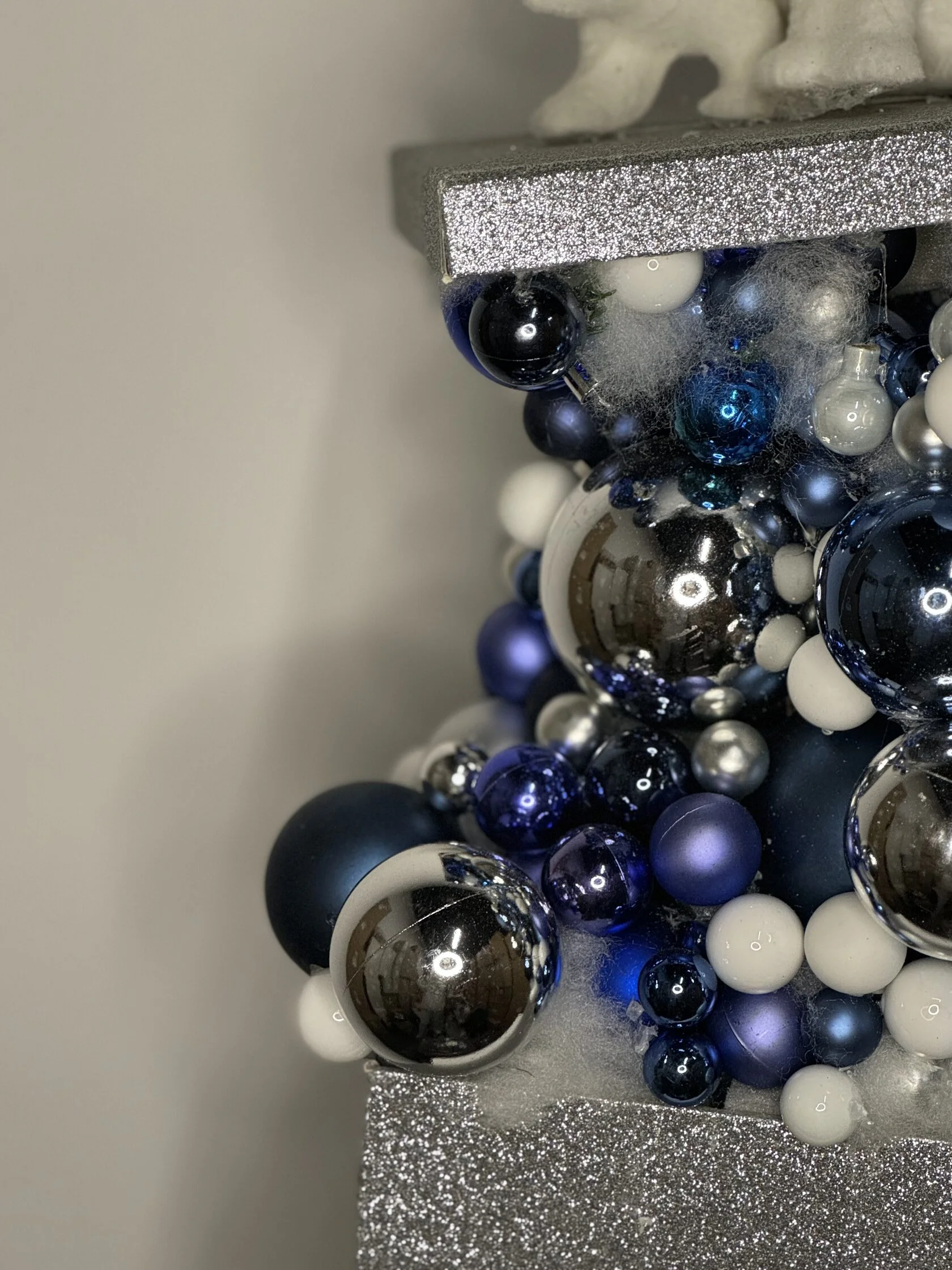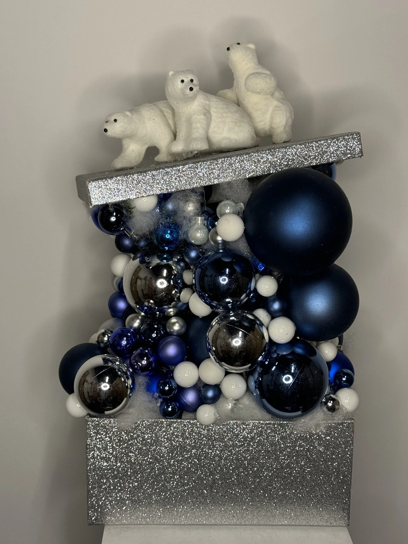 Три белых медведя стоят на сияющей серебристой платформе. Под ней находятся шары разных размеров и оттенков: синие, серебристые и белые. Этот контраст создаёт иллюзию снежного или ледяного покрова. Вся композиция покоится на блестящей серебристой основе.