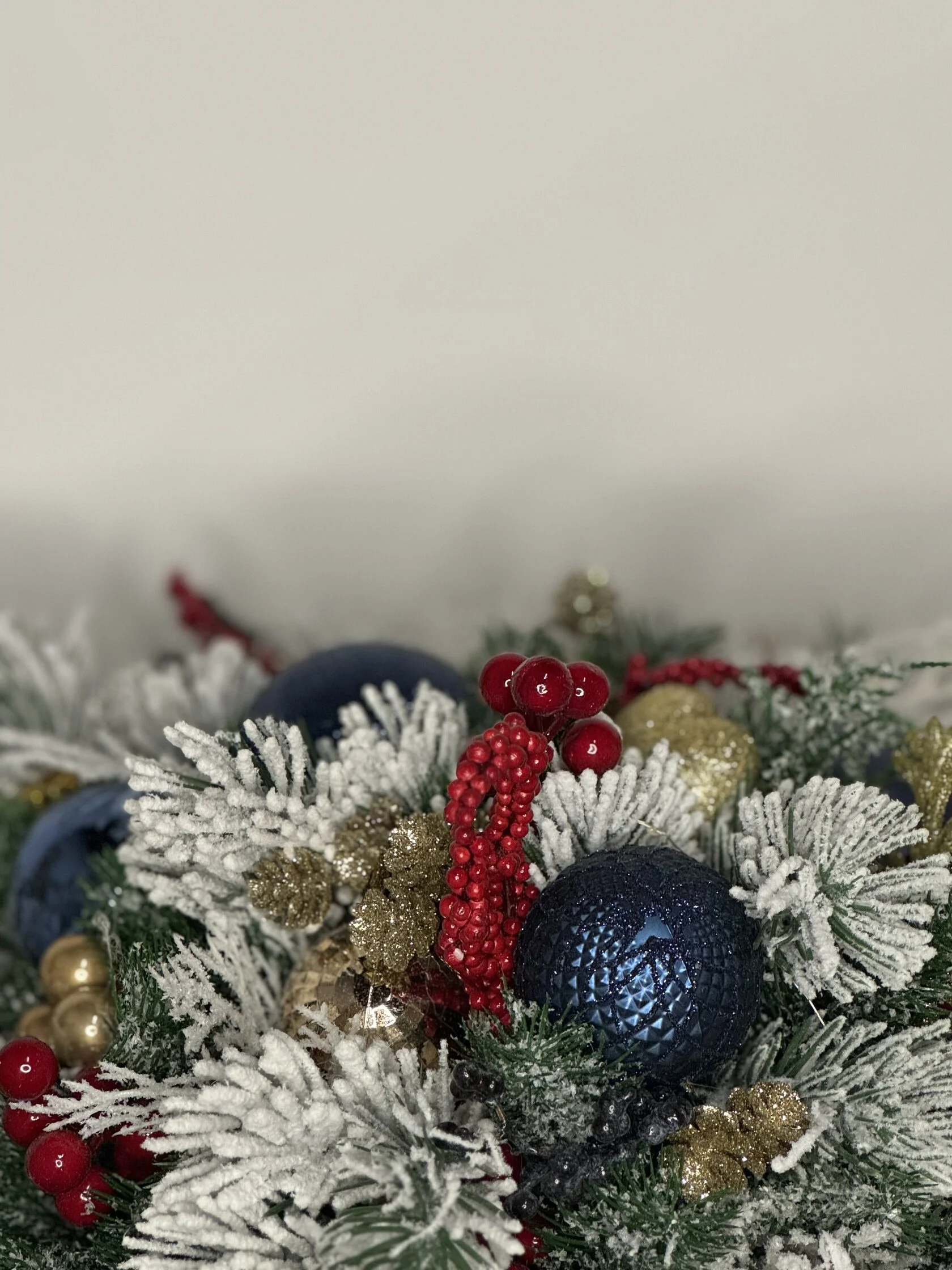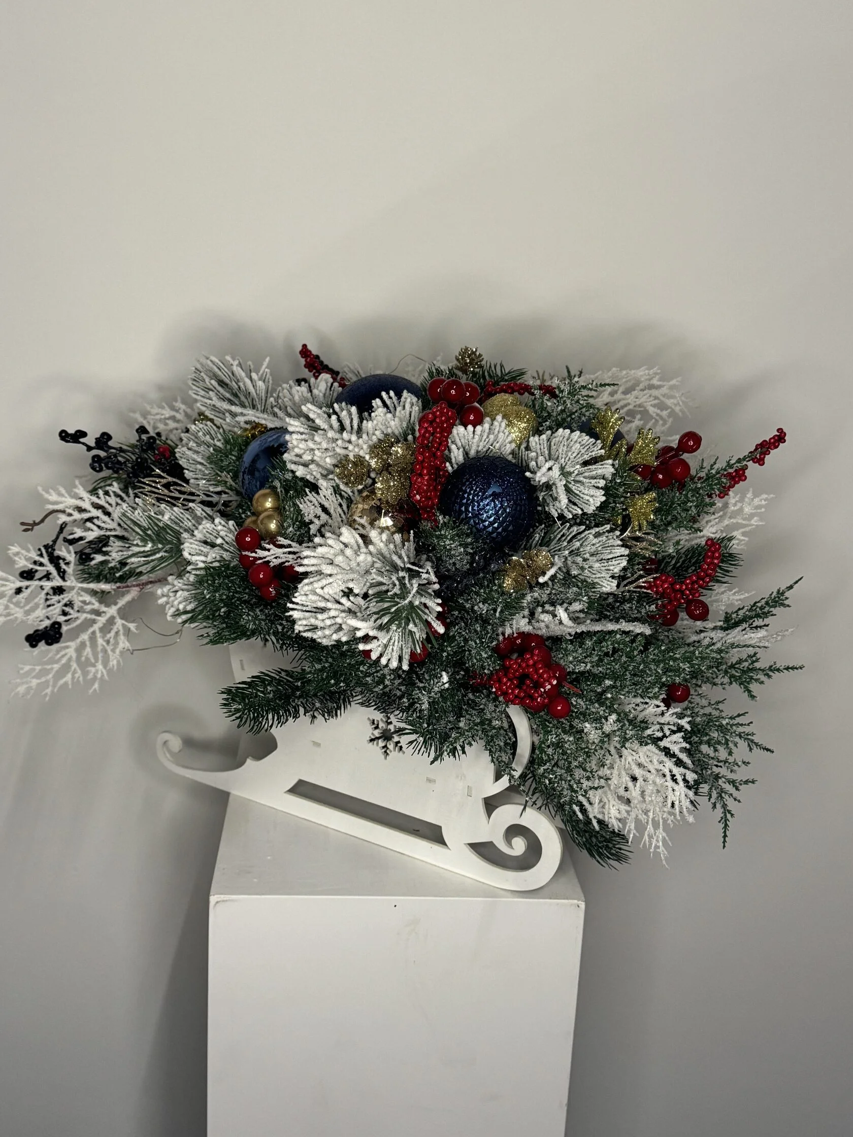 В центре новогодней композиции — белоснежные сани. Ветви хвойных деревьев украшены искусственным снегом. Шарики синего и золотого цветов, красные ягоды и изящные веточки создают атмосферу праздника и волшебства.