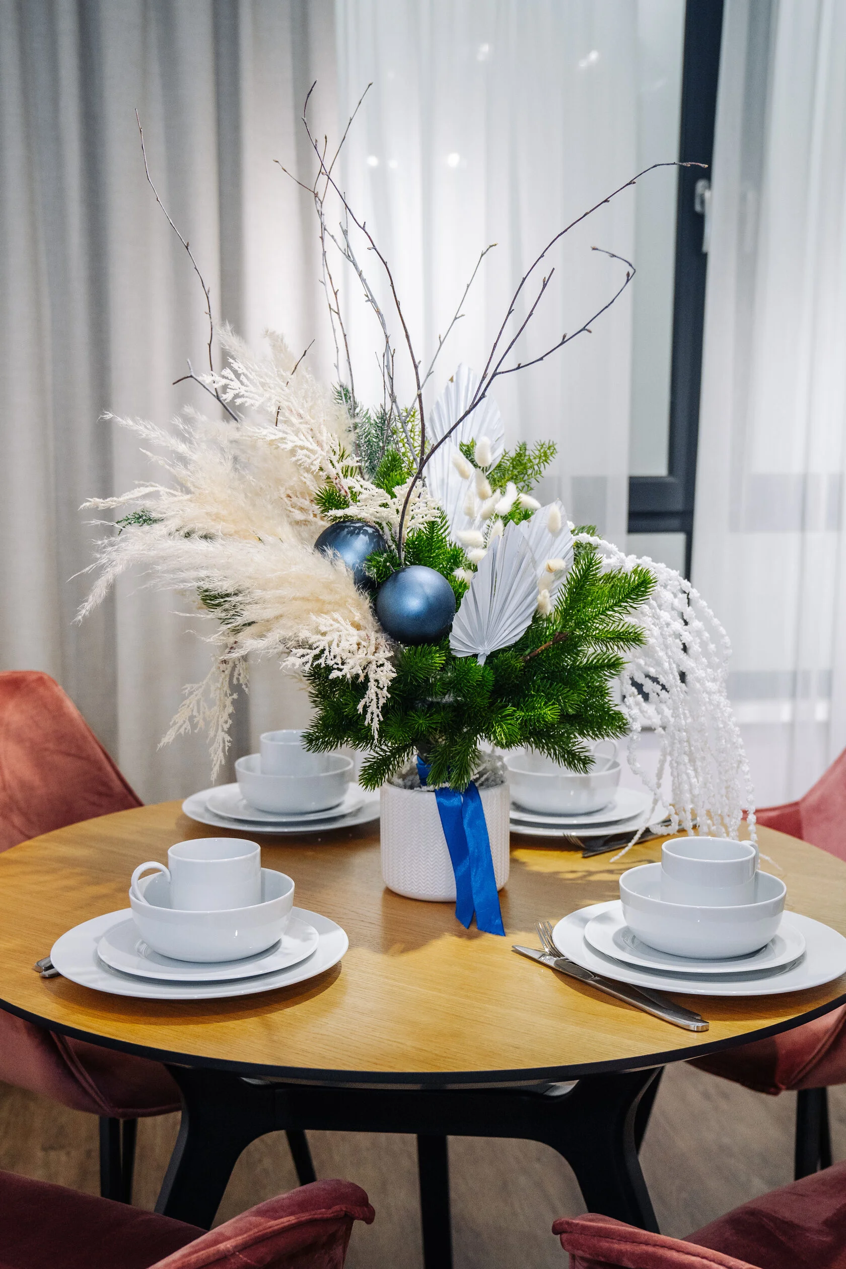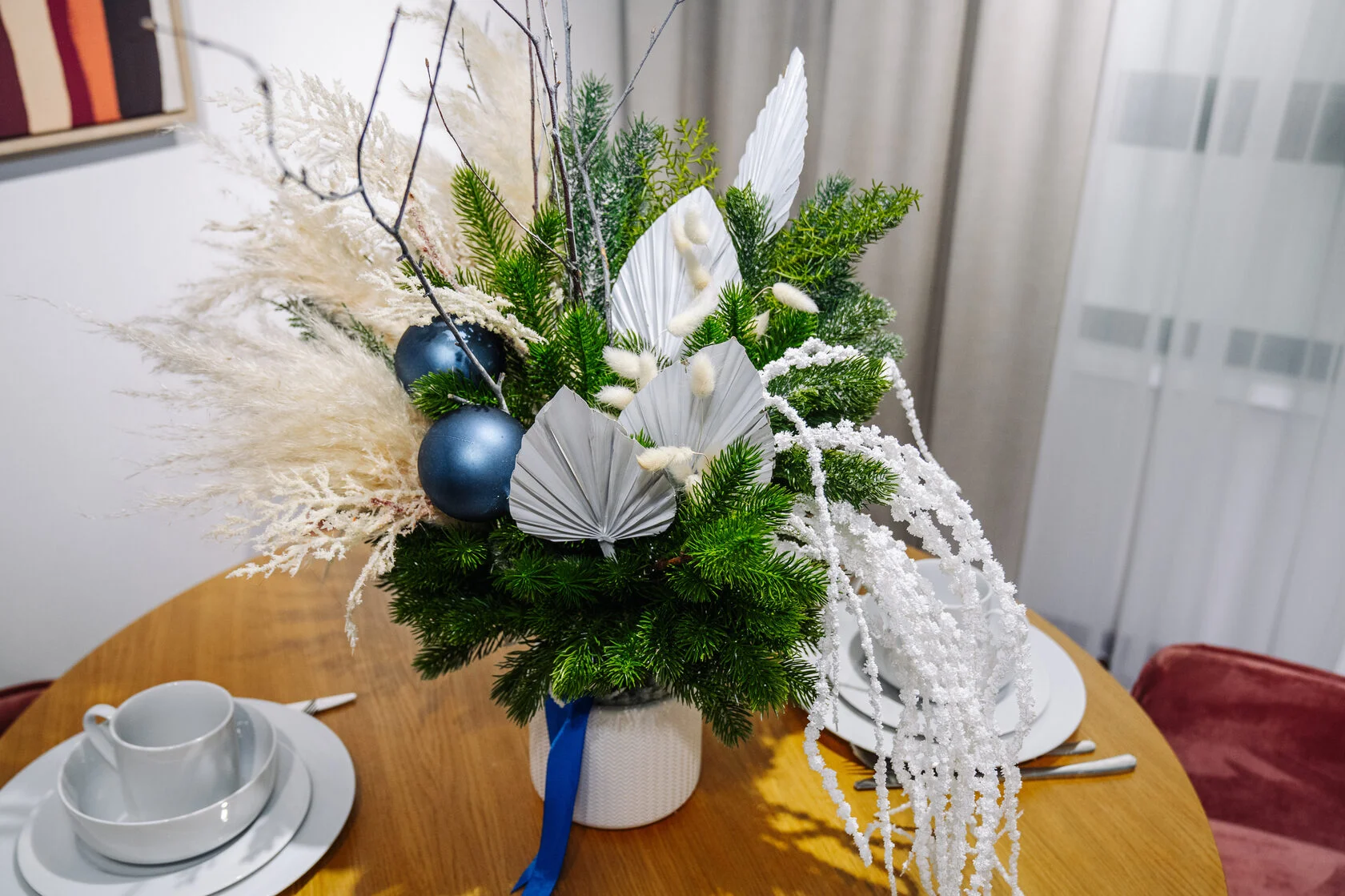 Эта композиция погружает в мир зимней сказки. Глубокий синий цвет шаров и декора мерцает на ветвях искусственной хвои, напоминая звёздное небо. Мерцающие акценты и разнообразие текстур создают атмосферу таинственности и элегантности, идеально подходящую для праздничного настроения.