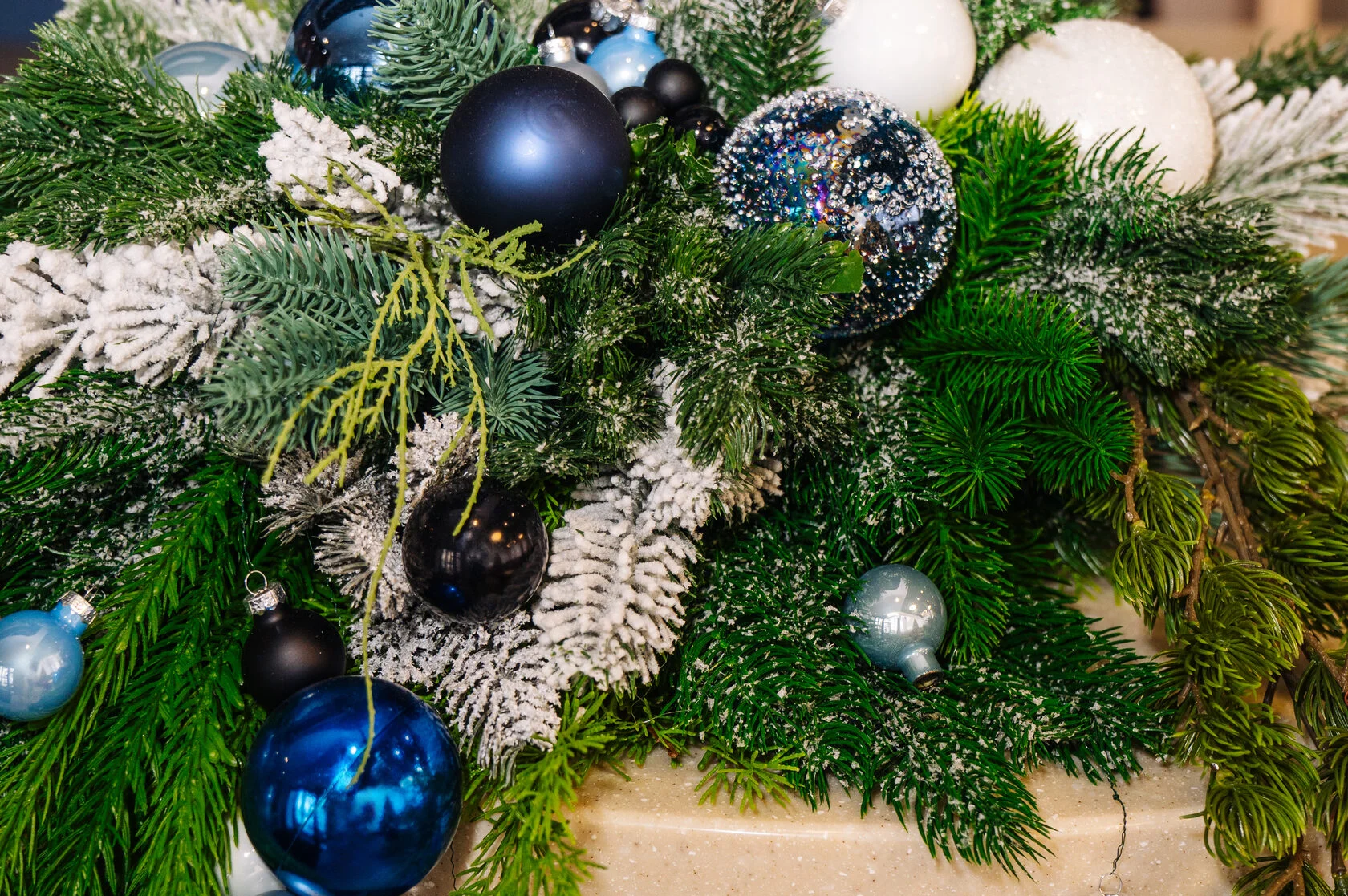 Пышные ветви искусственной хвои, холодные и изумрудные, словно покрытые инеем. Среди них словно распускаются первые зимние цветы — нежные белые бутоны. Сияющие шары оттенков белого, голубого и льдисто-синего переливаются, как застывшие капли морозного неба. Вся композиция излучает спокойствие, напоминая о тихой магии морозного утра, скрипе чистого снега и ожидании новогоднего чуда.