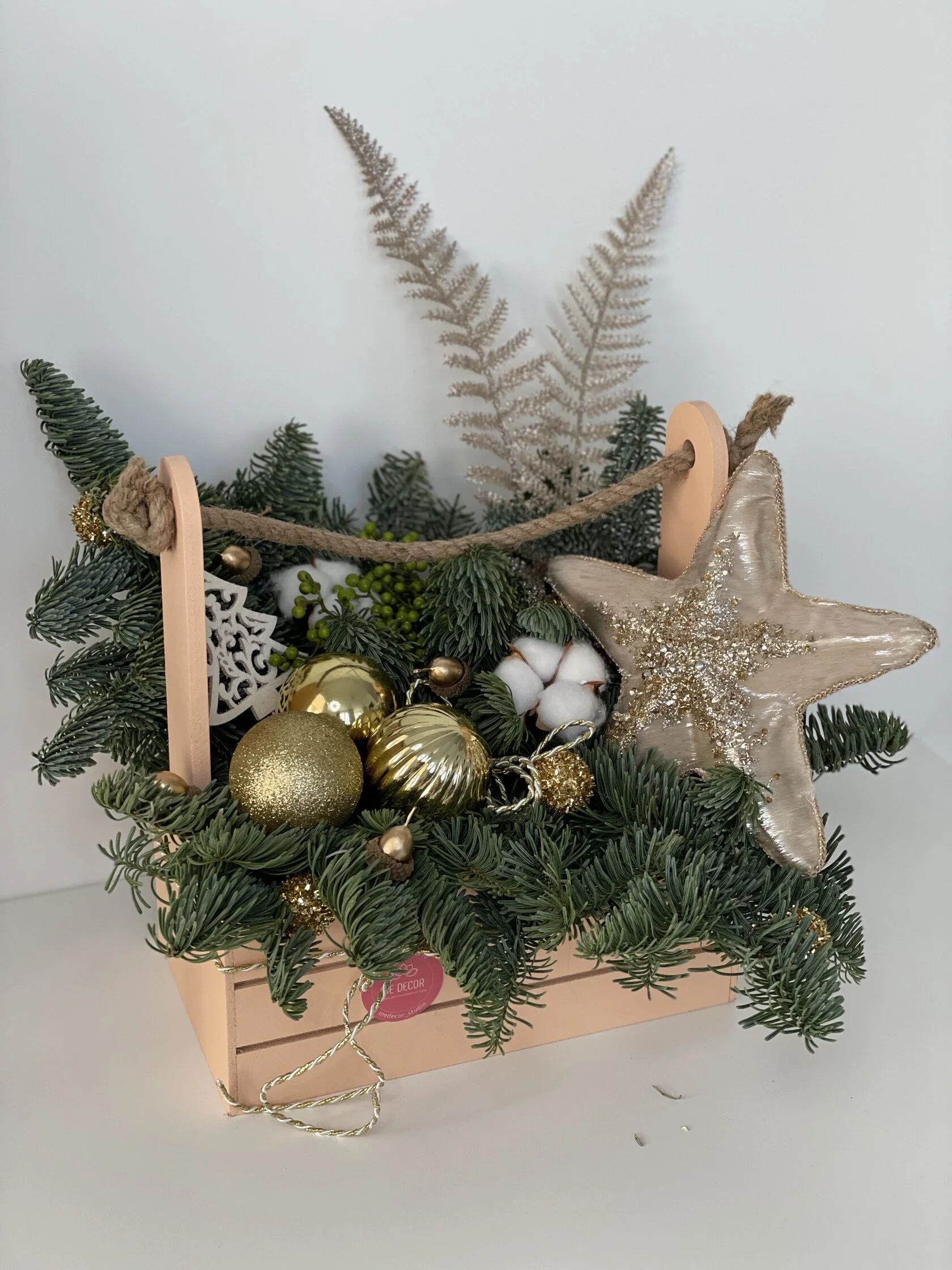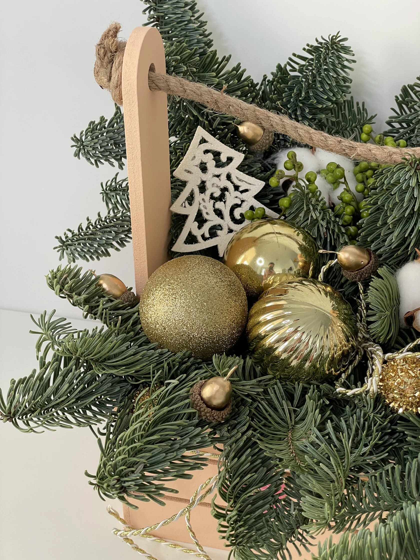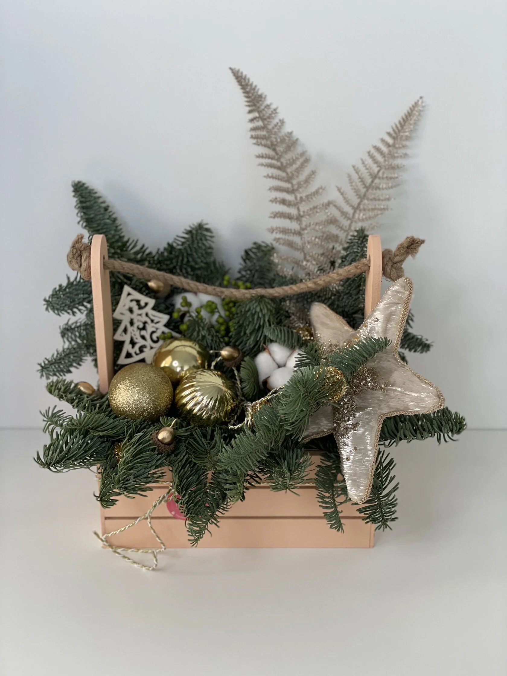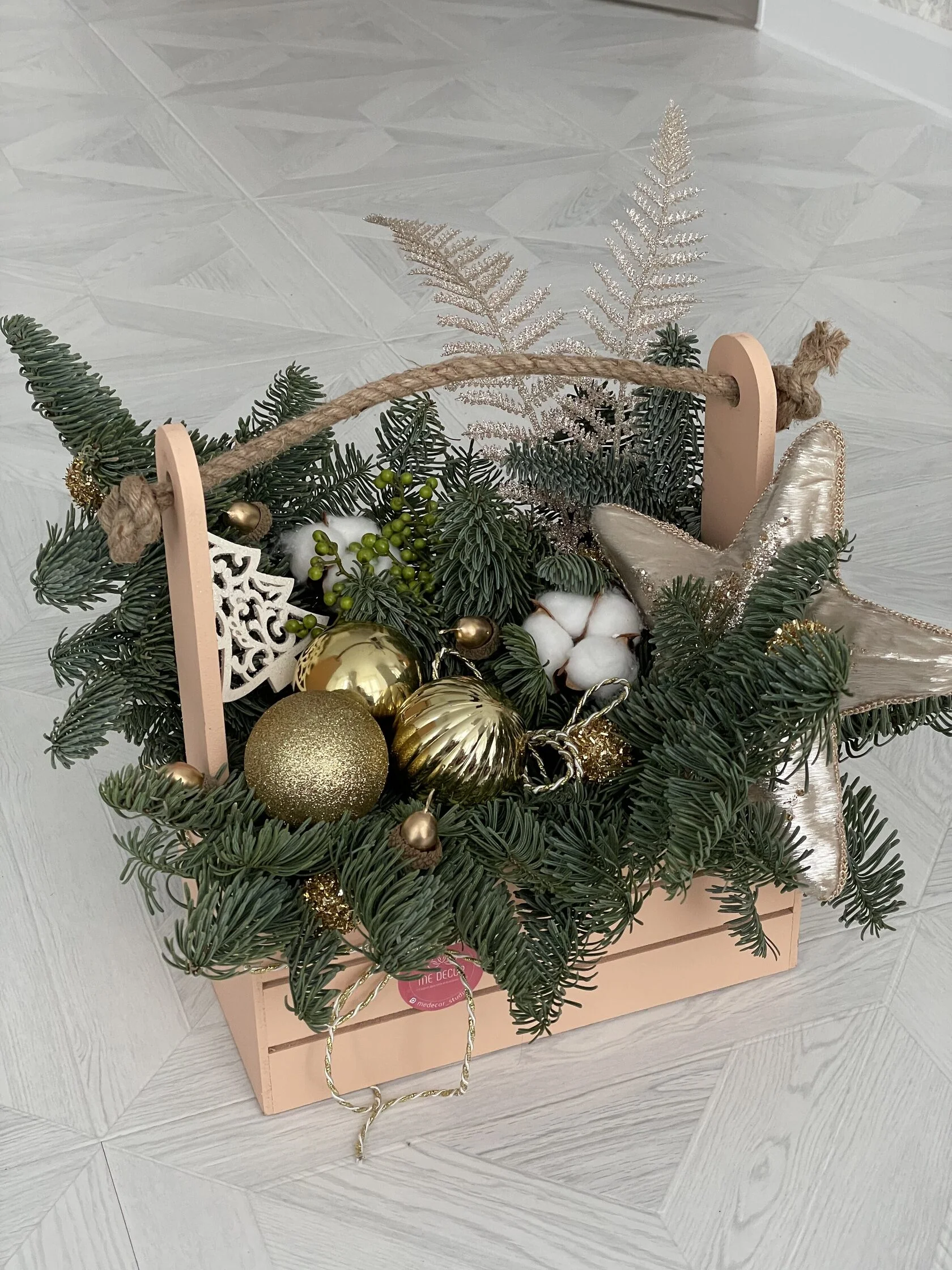 Изысканная композиция из свежего датского лапника с насыщенным ароматом.Элегантный декор включает в себя золотые шары, мягкий хлопок, новогодние фигурки и изящные веточки. Кашпо выполнено из натурального дерева, что придает композиции особую природную привлекательность.