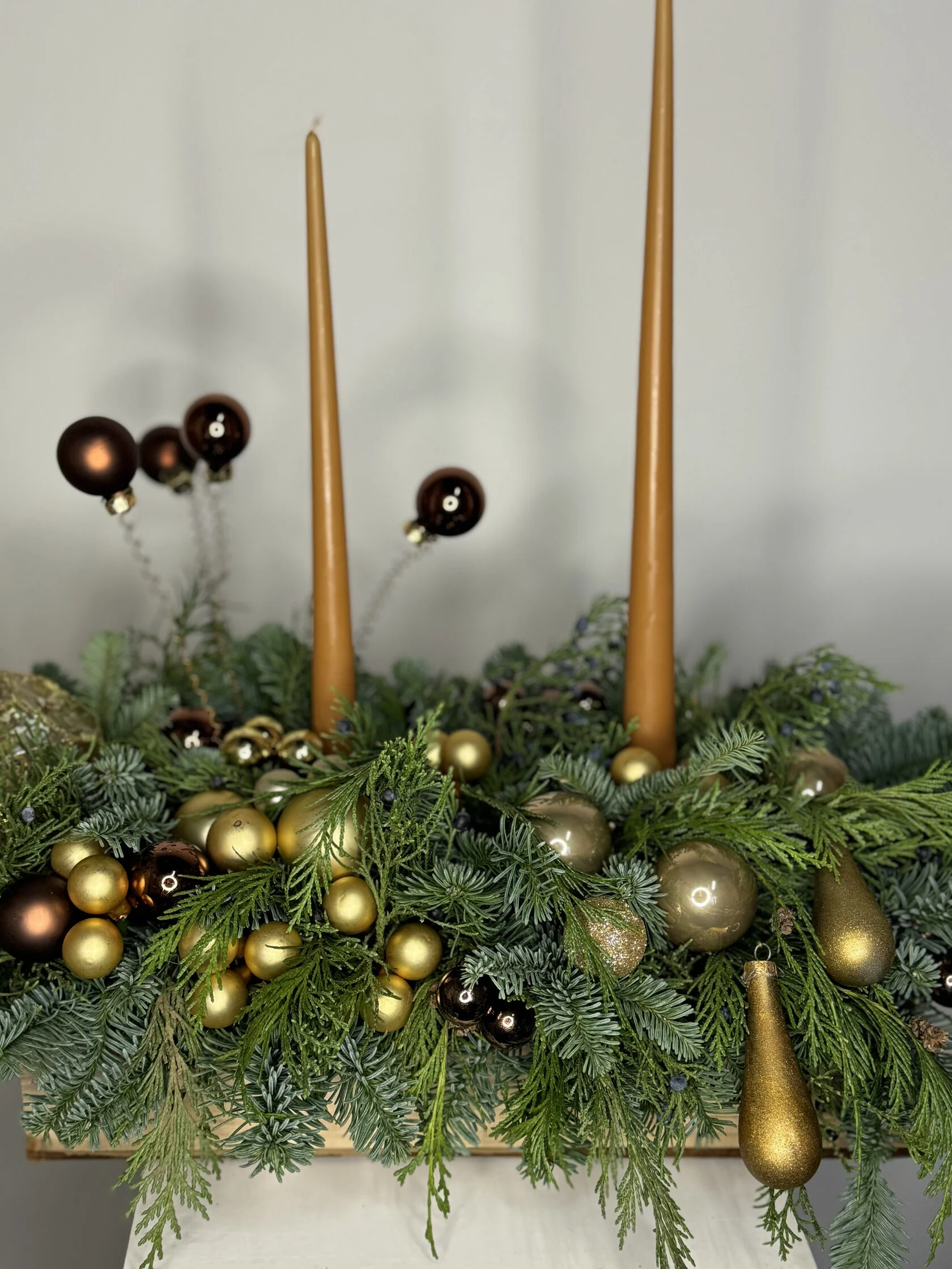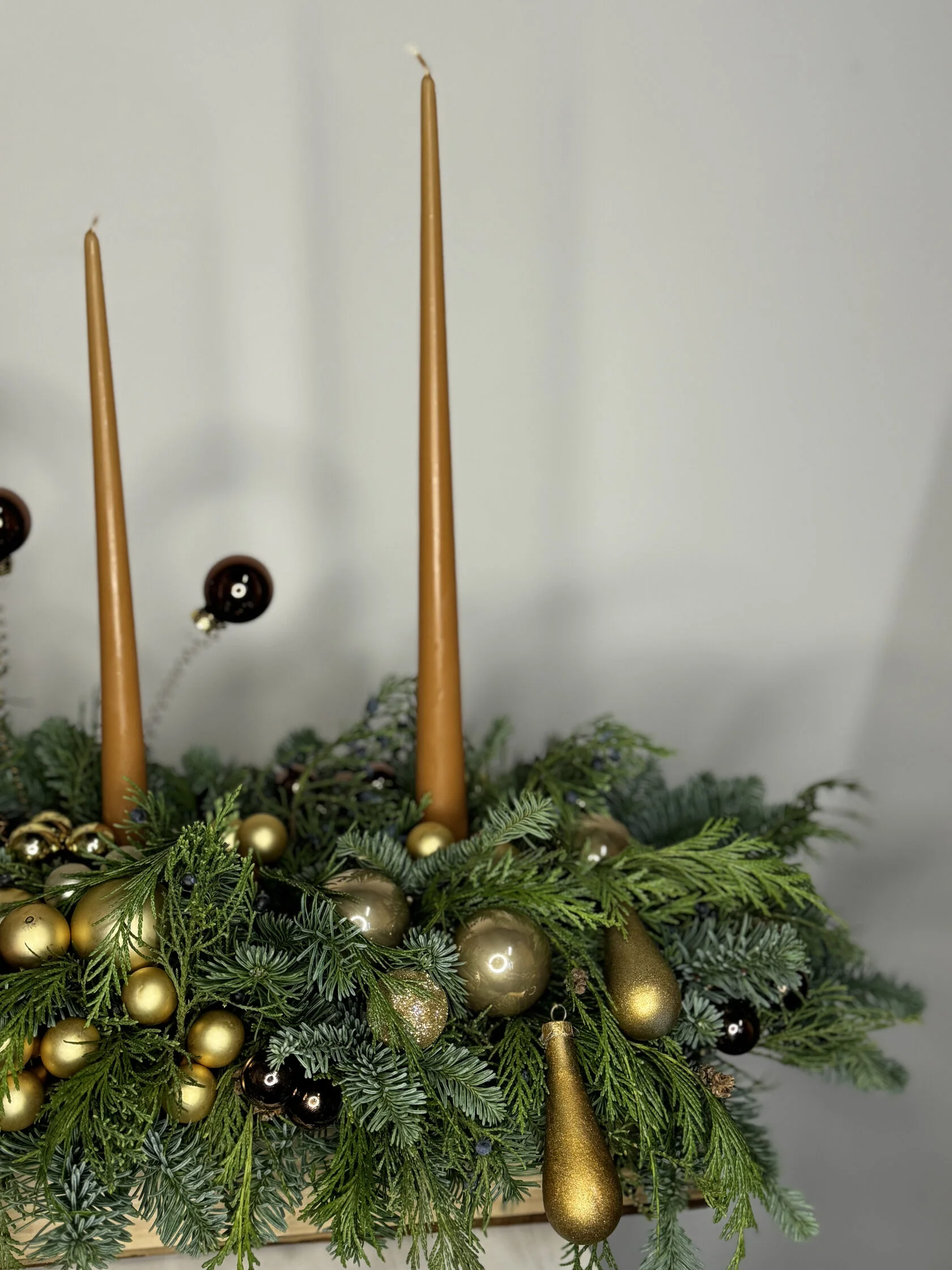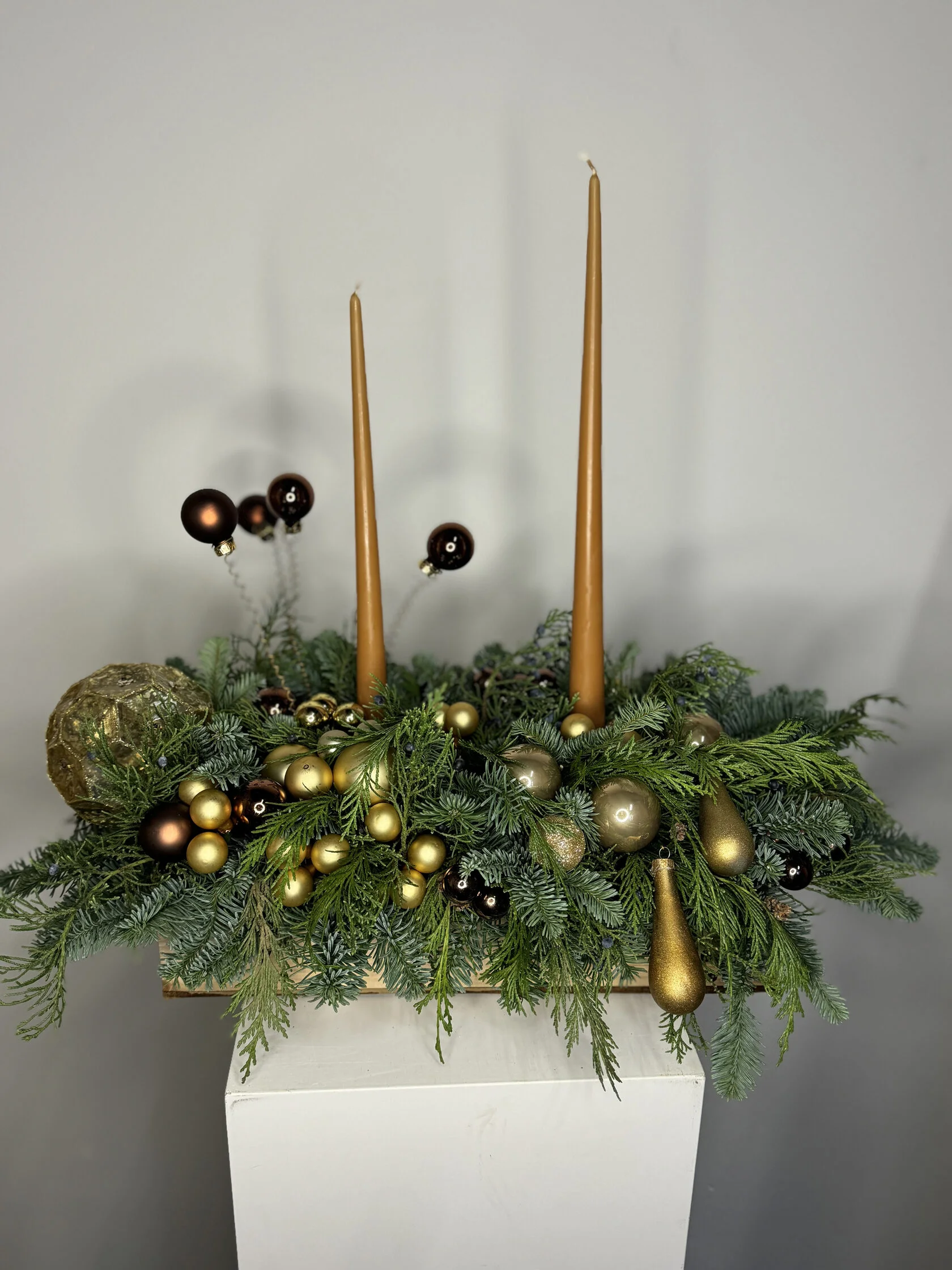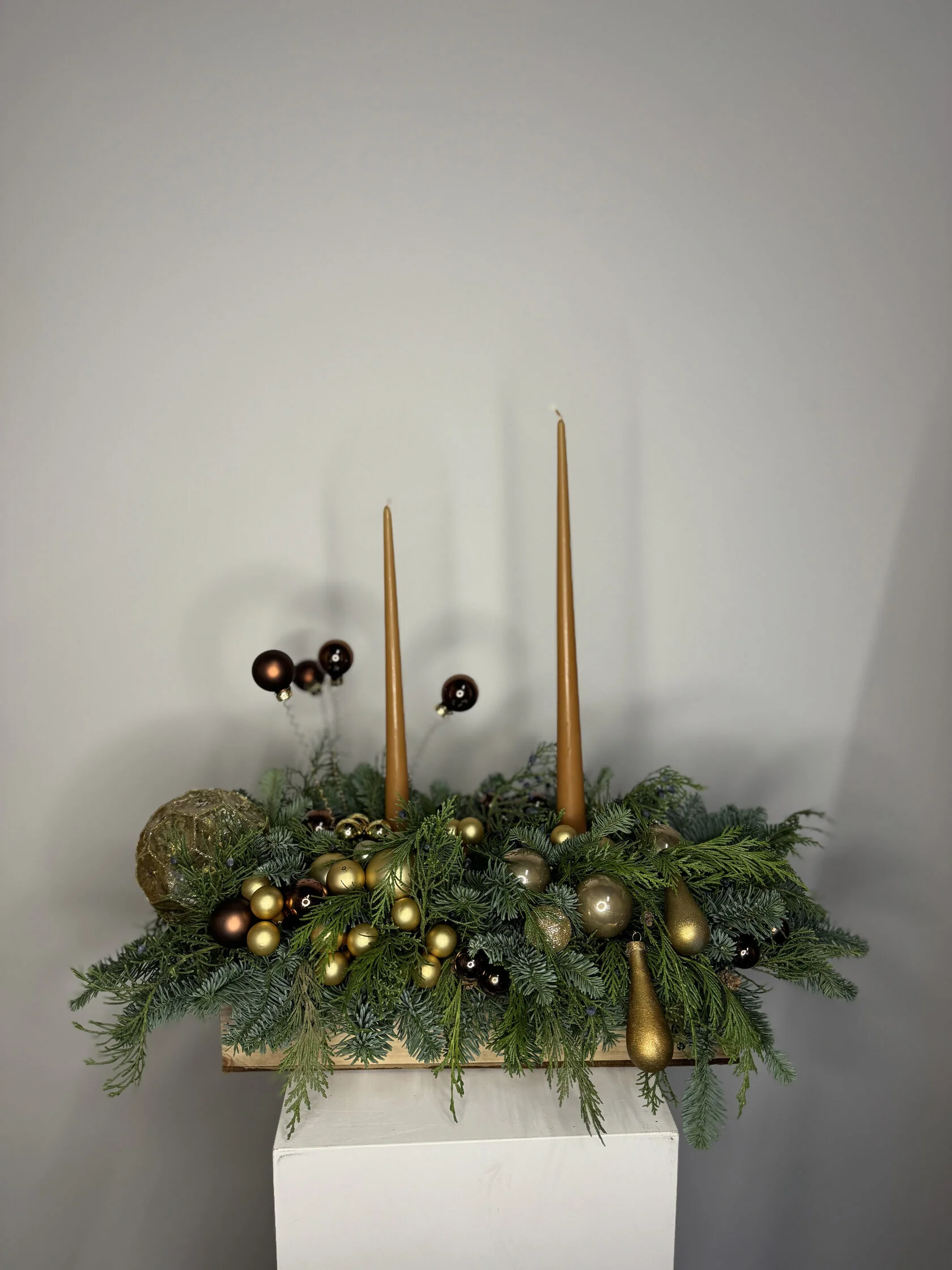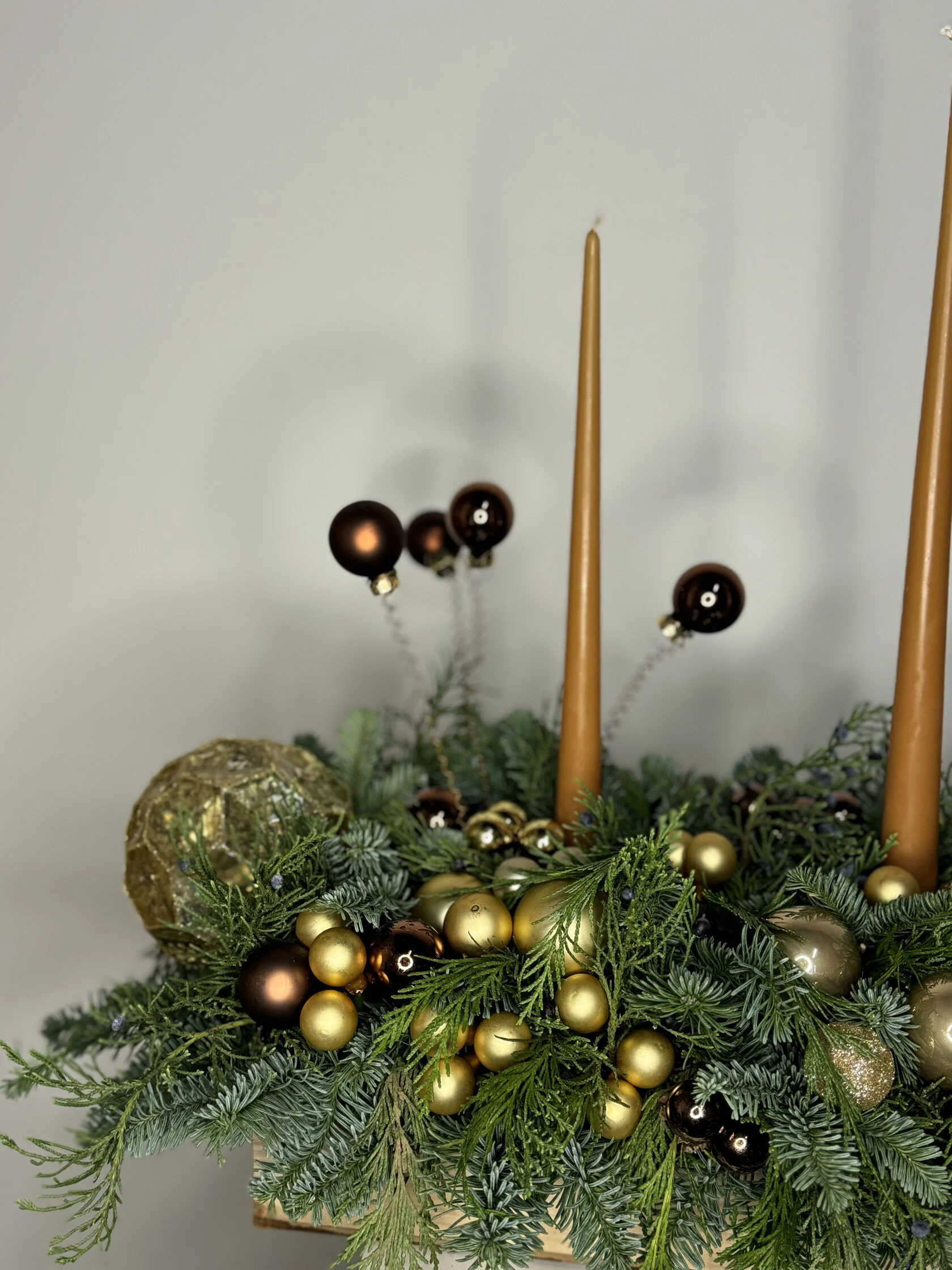 Композиция из живой хвои. В центре — две золотые свечи разной длины. Вокруг них — коричневые и золотые шарики, сосульки и большой пленный золотой шар. Завершает композицию деревянное кашпо.