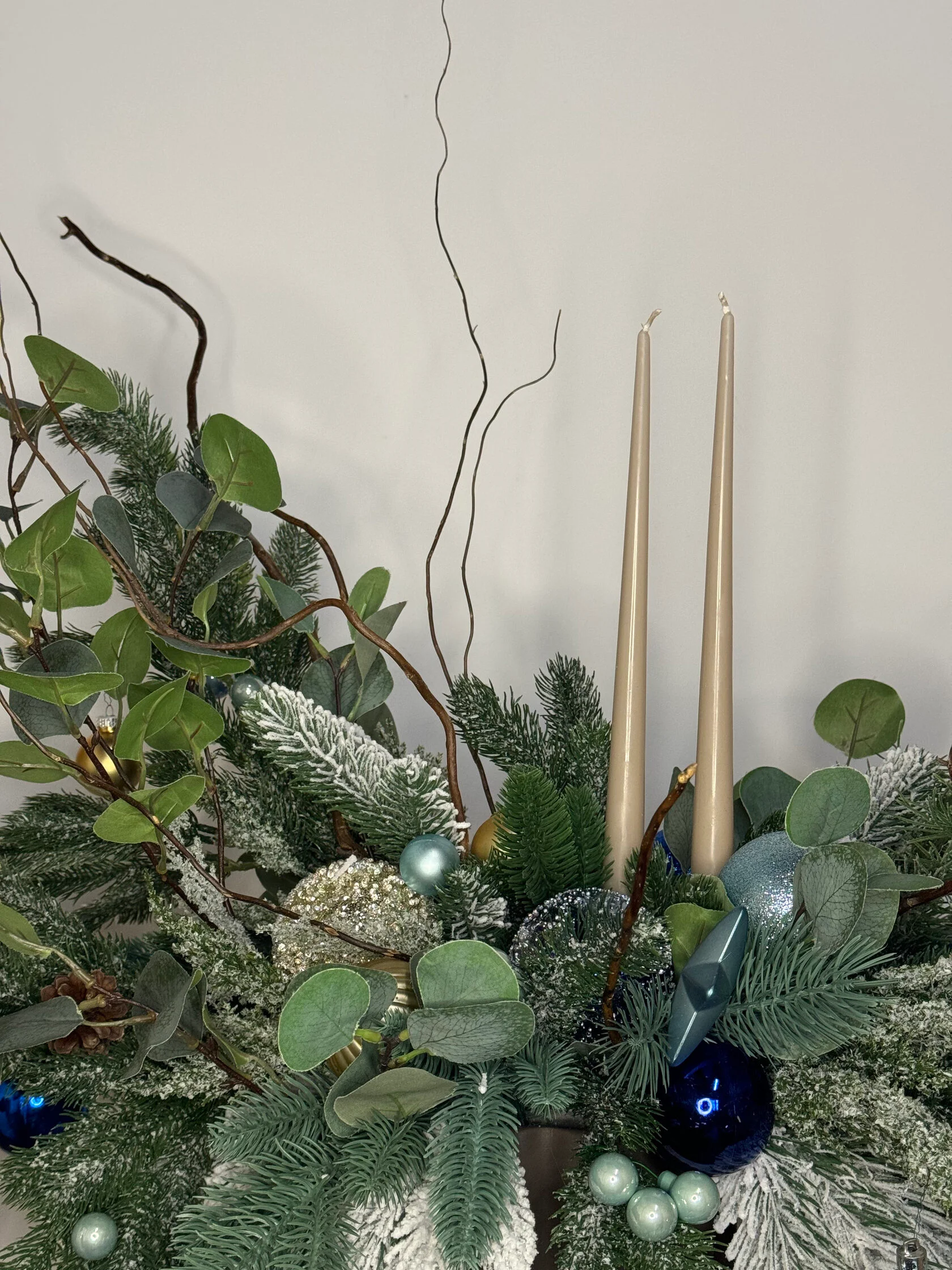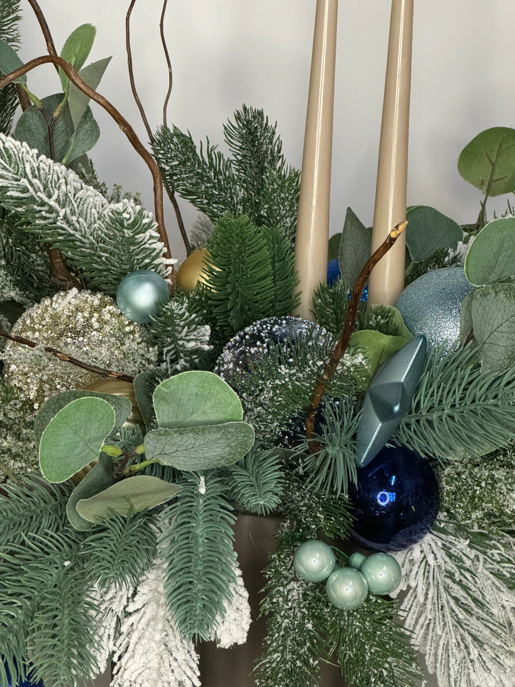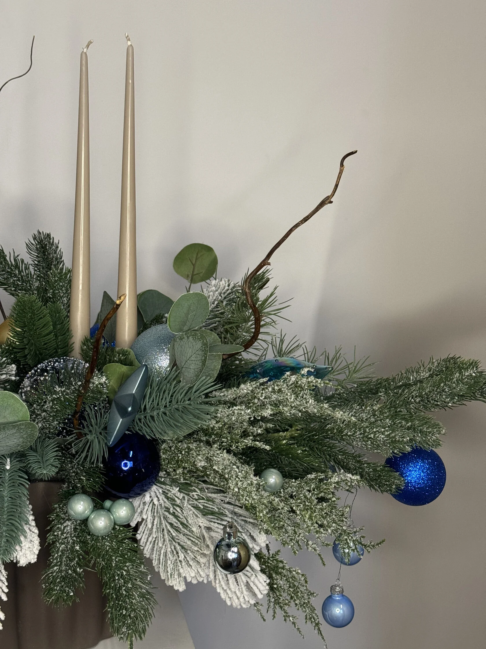Композиция из живых еловых веток. В центре — две золотые свечи. Вокруг — синие и голубые шары, серебристые сосульки и веточки, покрытые инеем. Дополняют композицию настоящие шишки и зелёные лианы.