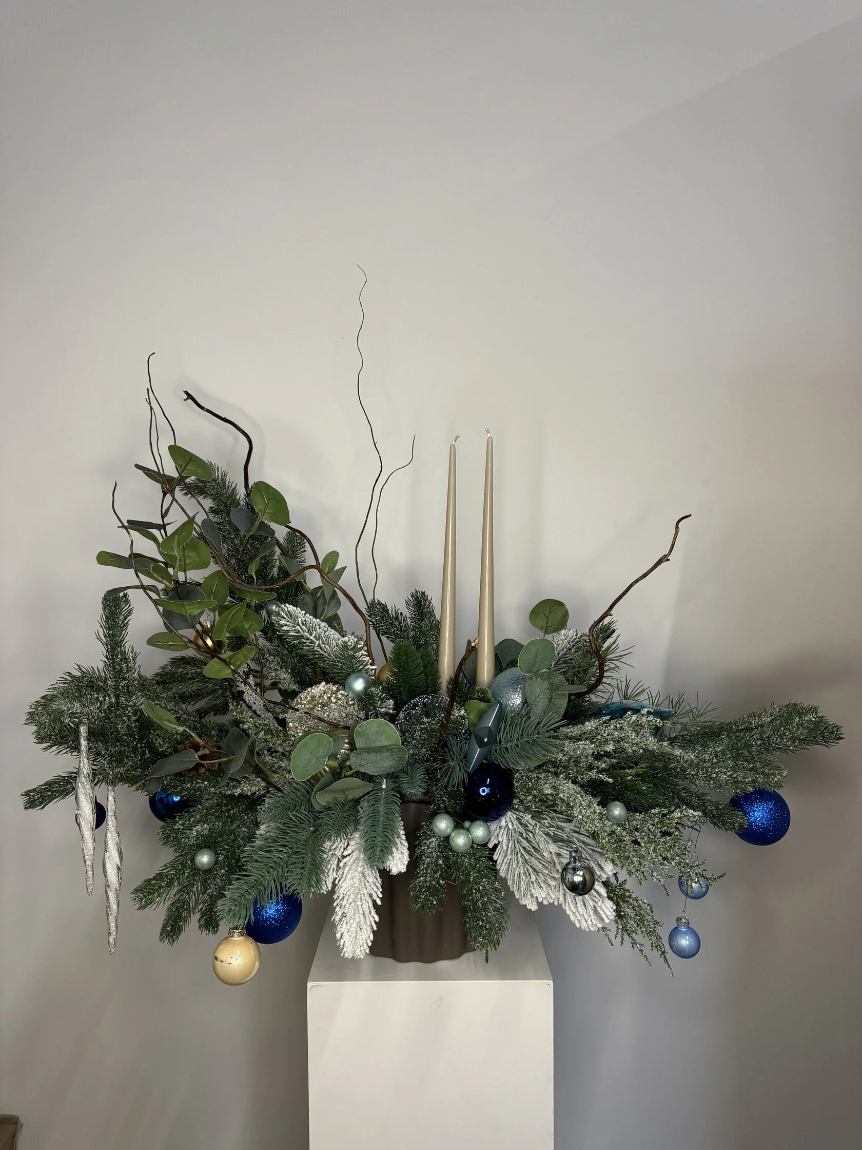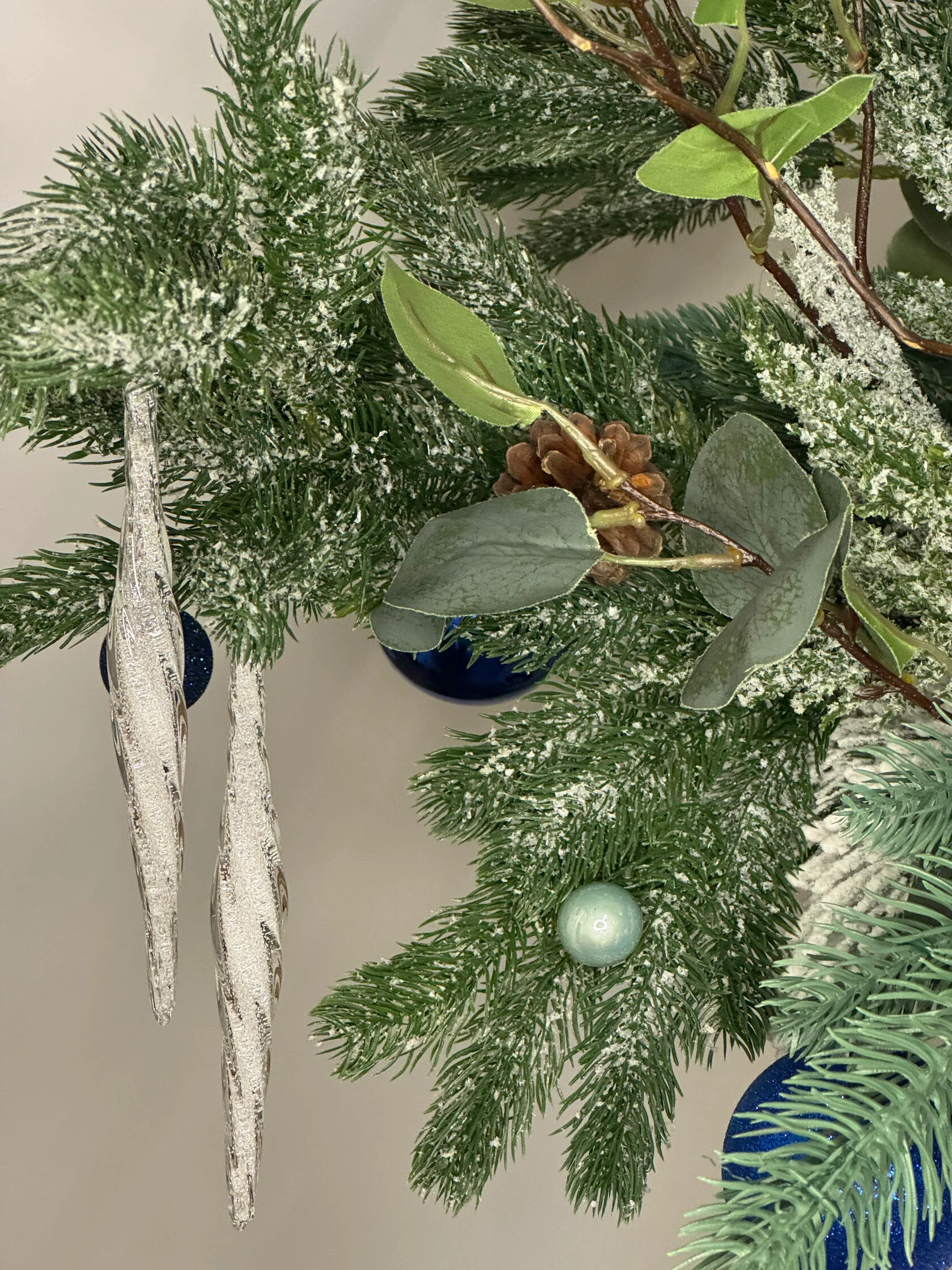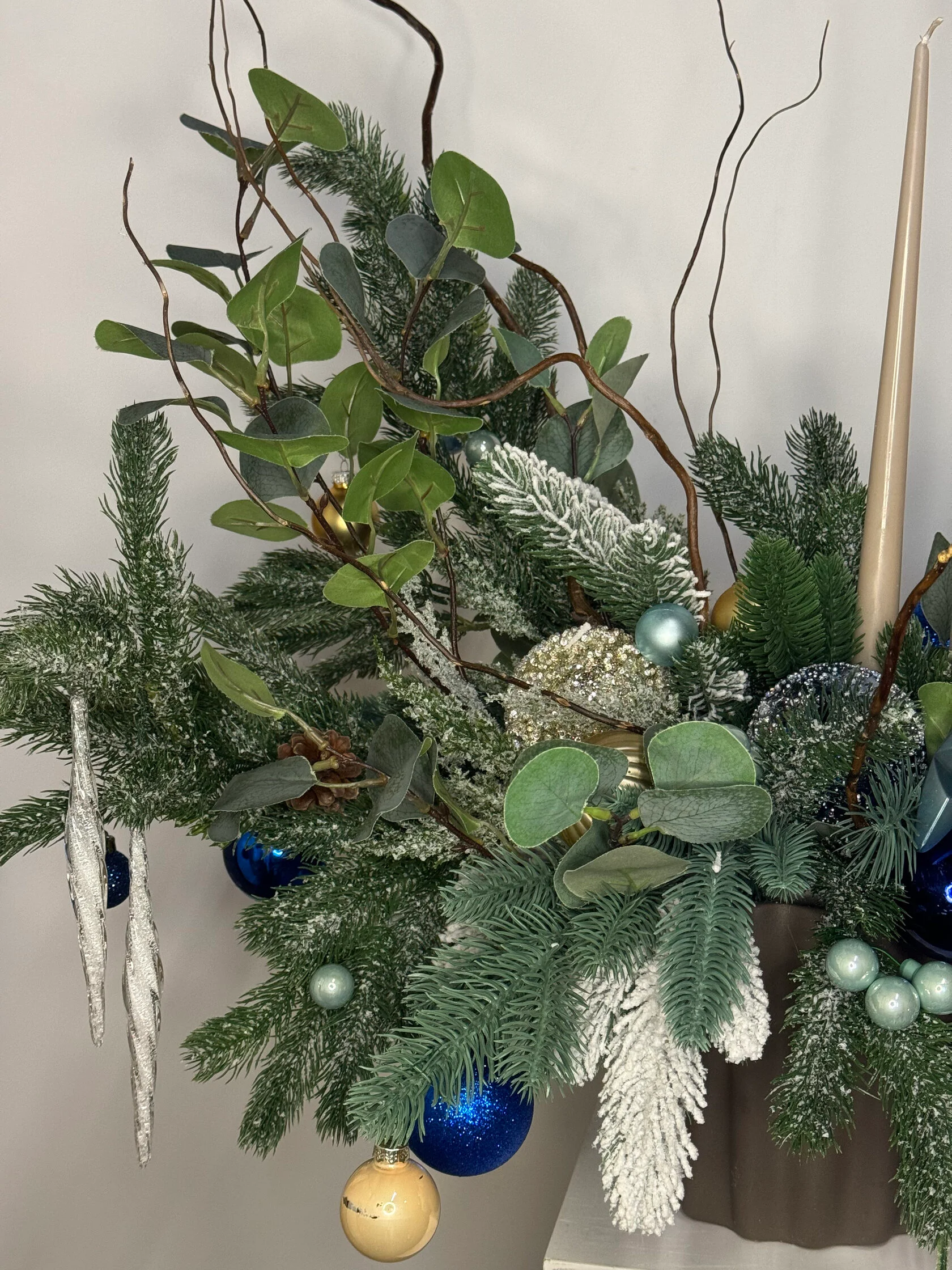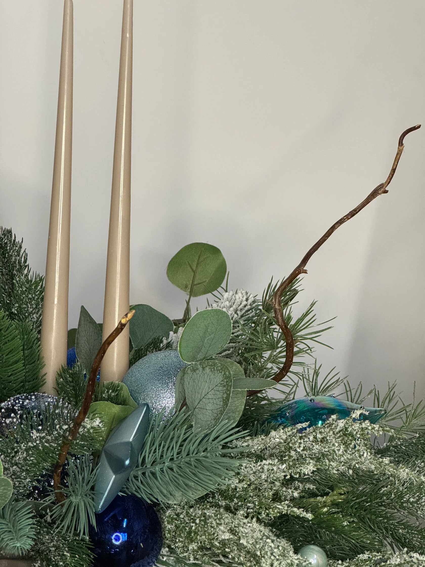 Композиция из живых еловых веток. В центре — две золотые свечи. Вокруг — синие и голубые шары, серебристые сосульки и веточки, покрытые инеем. Дополняют композицию настоящие шишки и зелёные лианы.