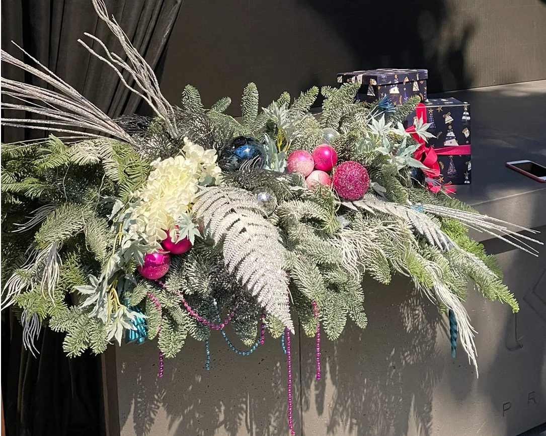 Композиция из искусственной хвои премиального качества — это изящное и продуманное художественное решение. Её декор выполнен в синих и фуксиевых тонах с использованием шаров, веточек и бус. Это придаёт композиции утончённость и элегантность.
