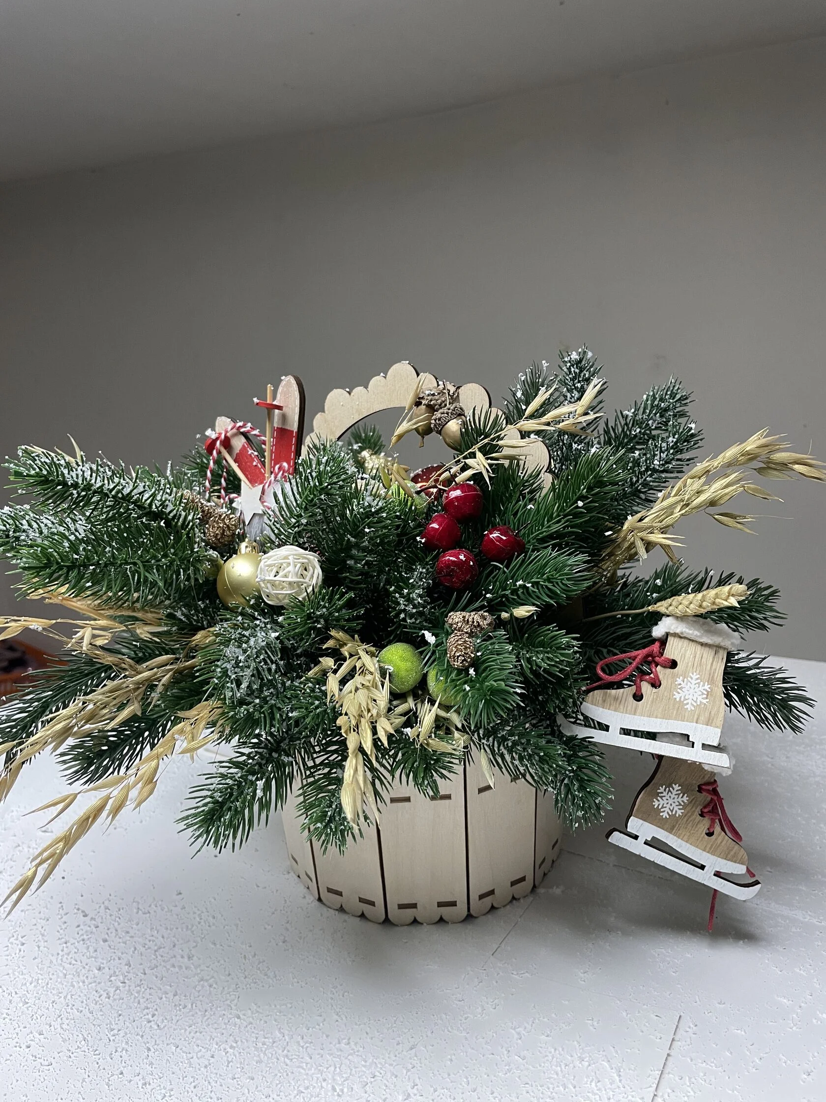 Композиция из искусственной хвои, создающей иллюзию заснеженных ветвей. Украшена декоративными веточками и деревянными игрушками. Кашпо изготовлено из дерева.
