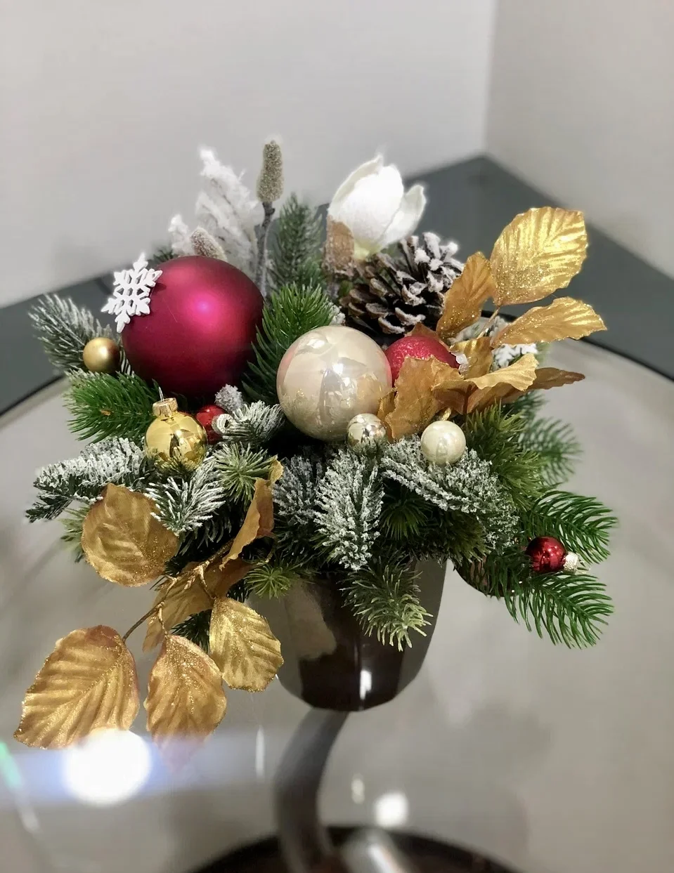 Композиция включает в себя ветки ели, покрытые золотыми листьями и украшенные красными и золотыми шарами. Все элементы собраны в металлическую вазу.