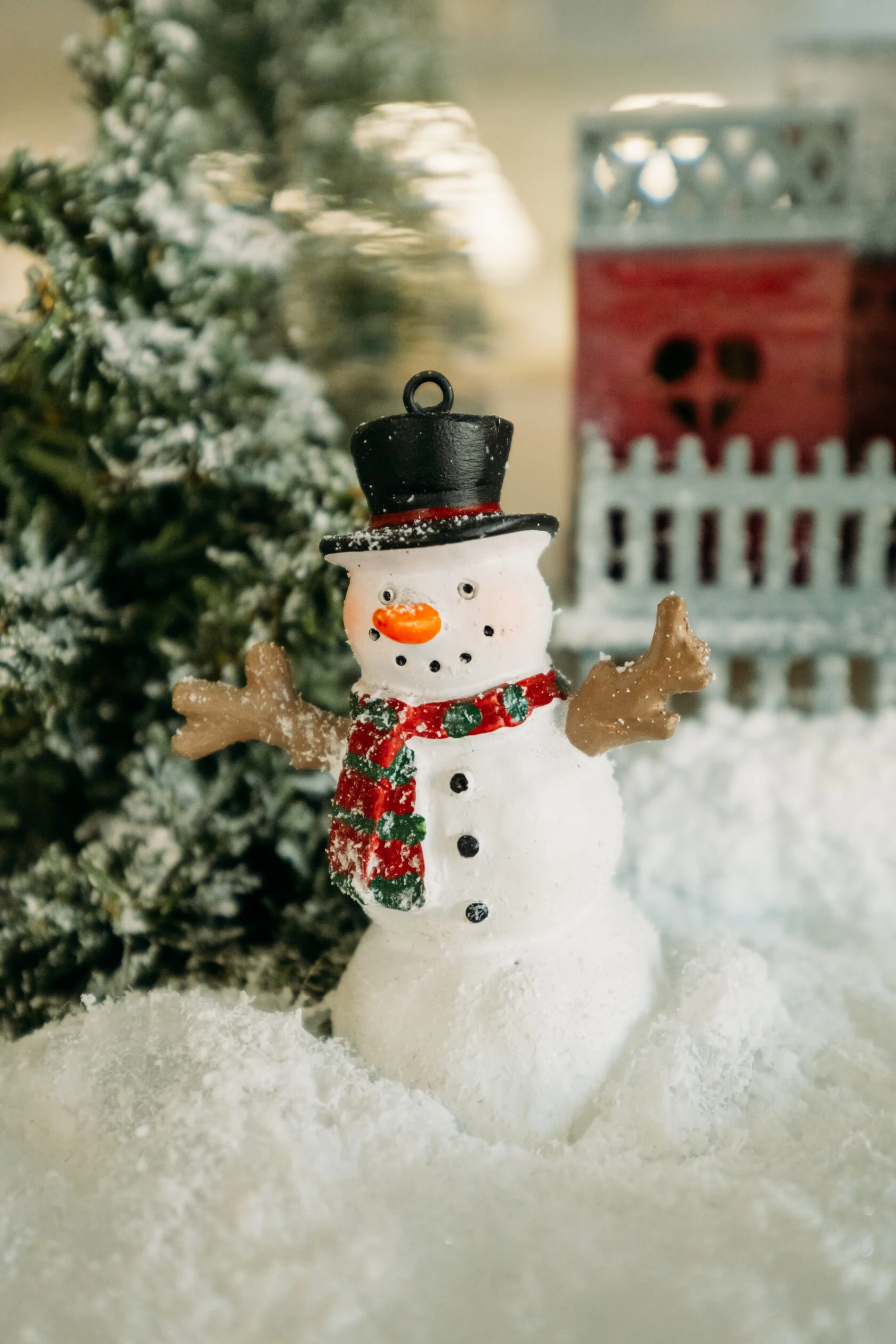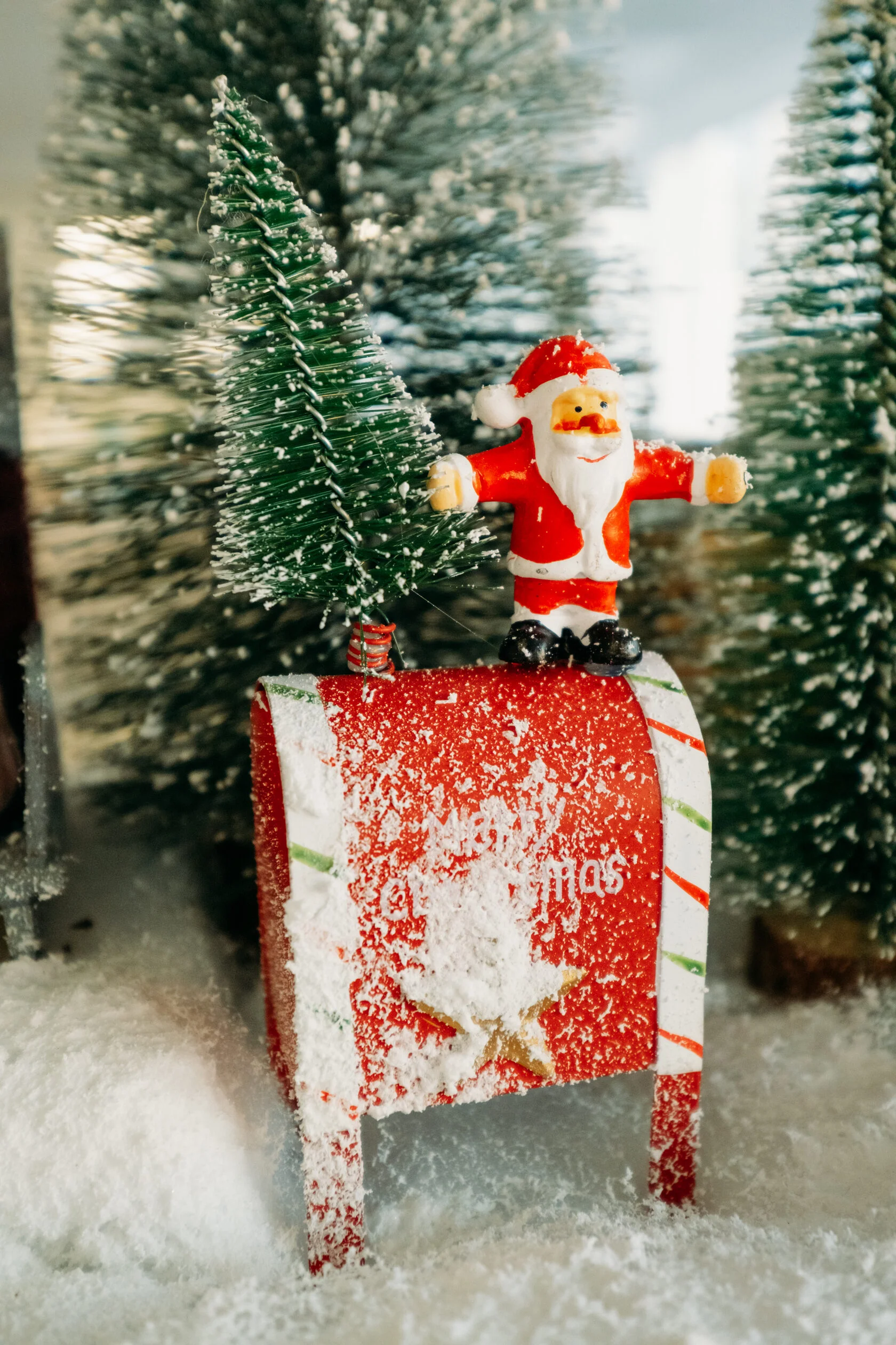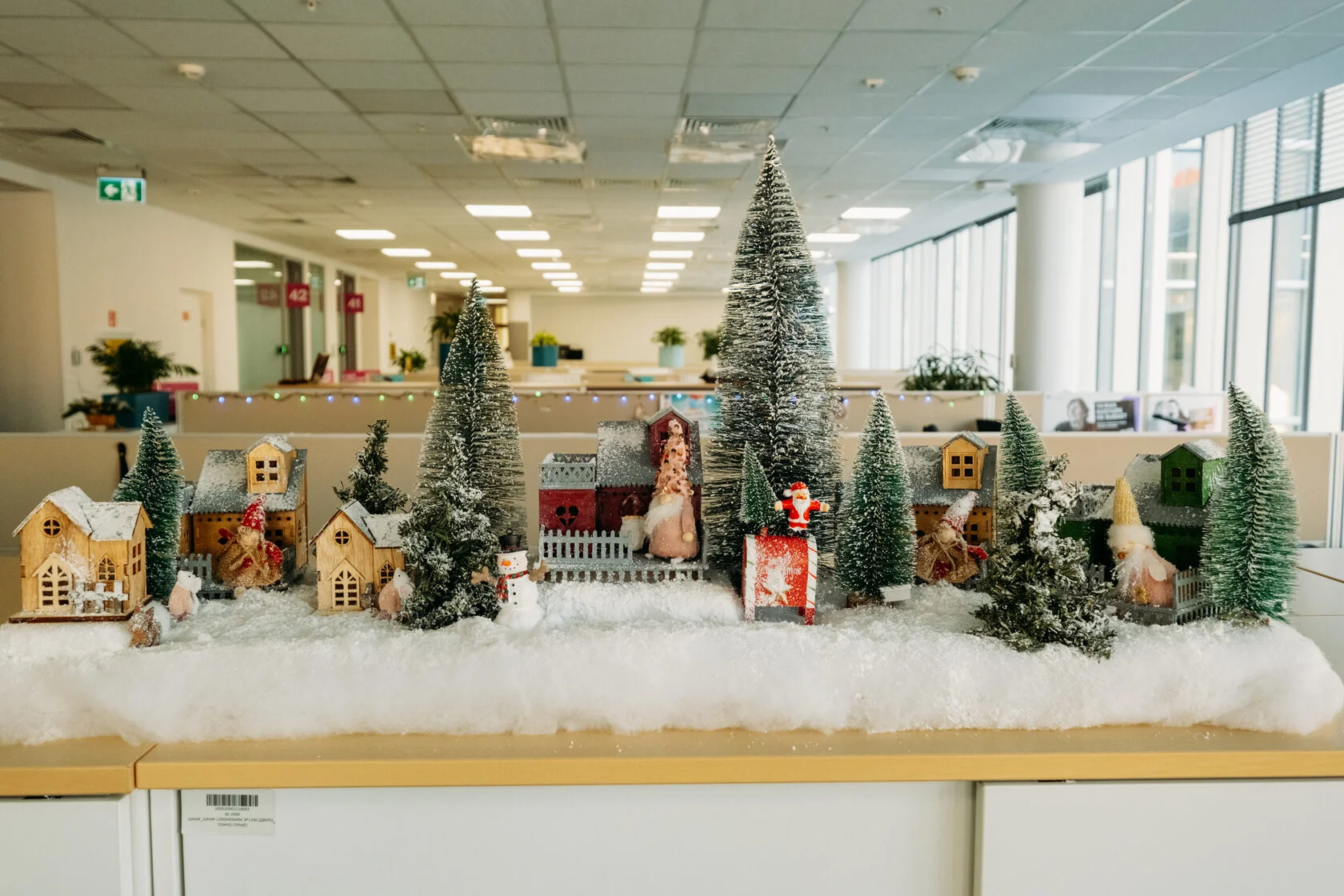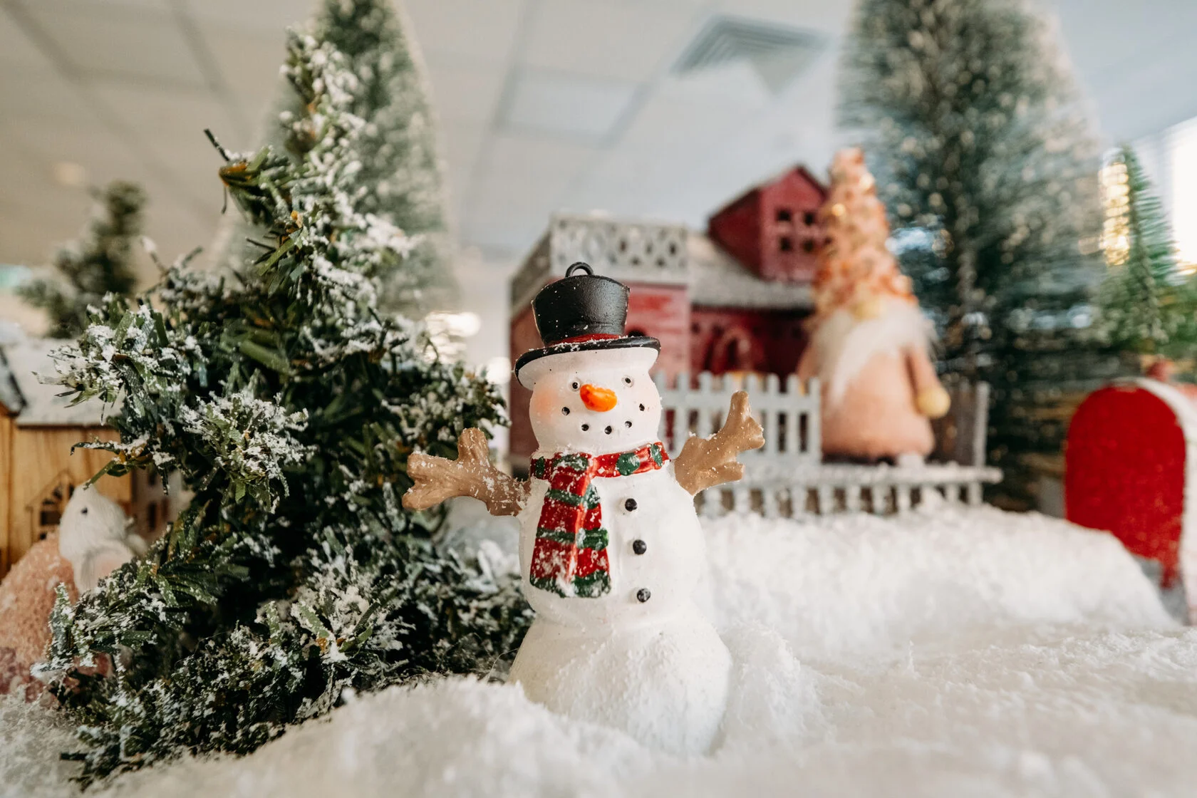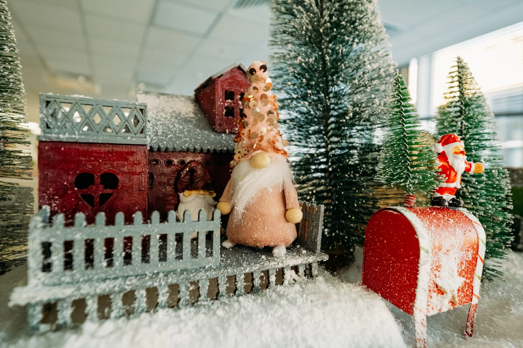 Композиция состоит из миниатюрных деревянных домиков, украшенных искусственным снегом. Рядом возвышаются ёлки, покрытые снежным покрывалом. В центре деревни — фигурка снеговика, а рядом с ним — Санта-Клаус. Вокруг деревни расположены небольшие заборчики и другие декоративные элементы.
