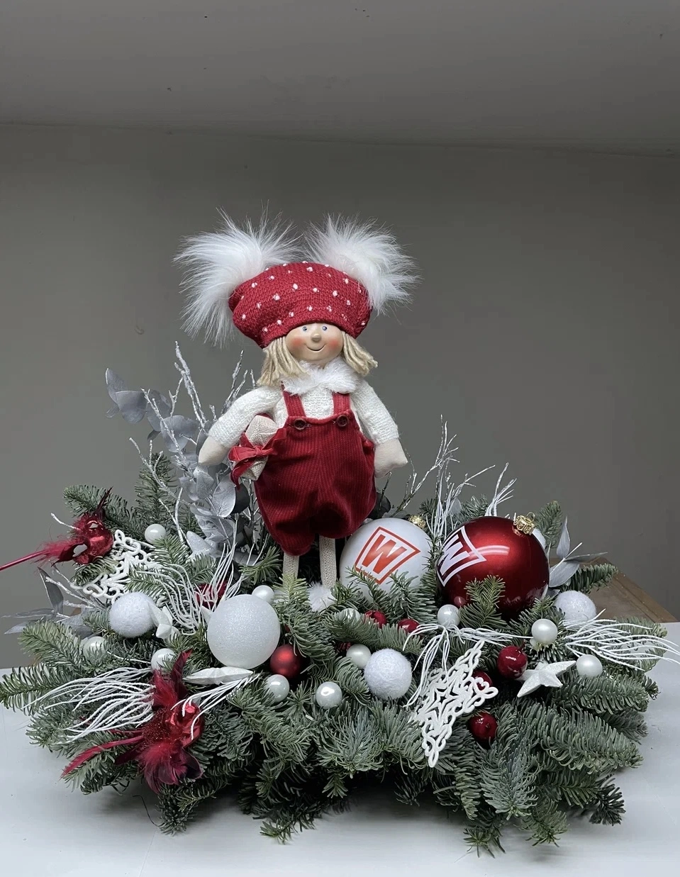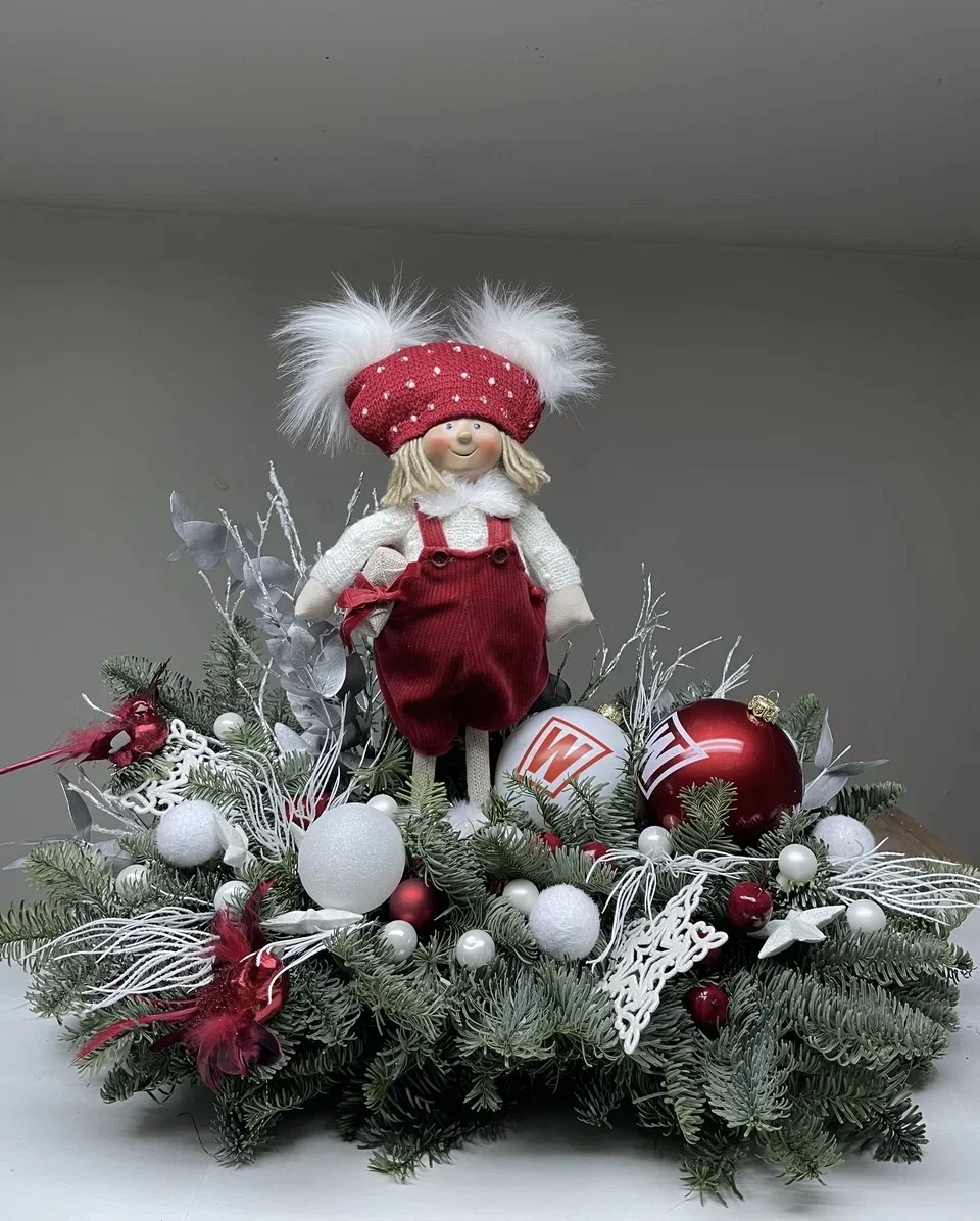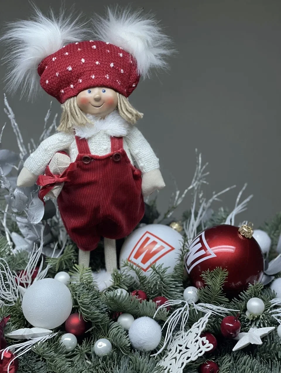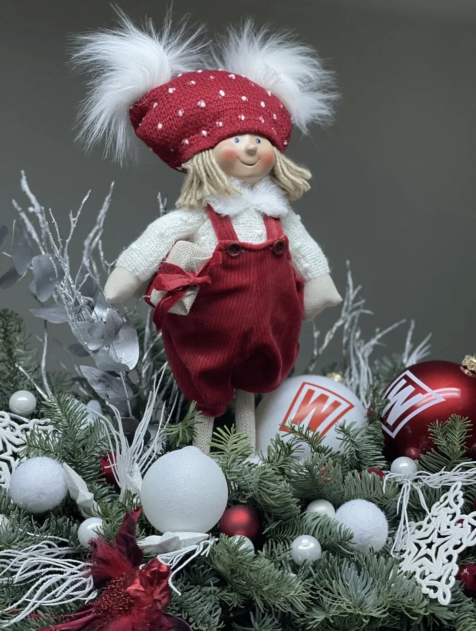 В центре внимания находится очаровательная кукла в красной шапке и комбинезоне, украшенная белыми и красными шарами, а также окруженная еловыми ветками.