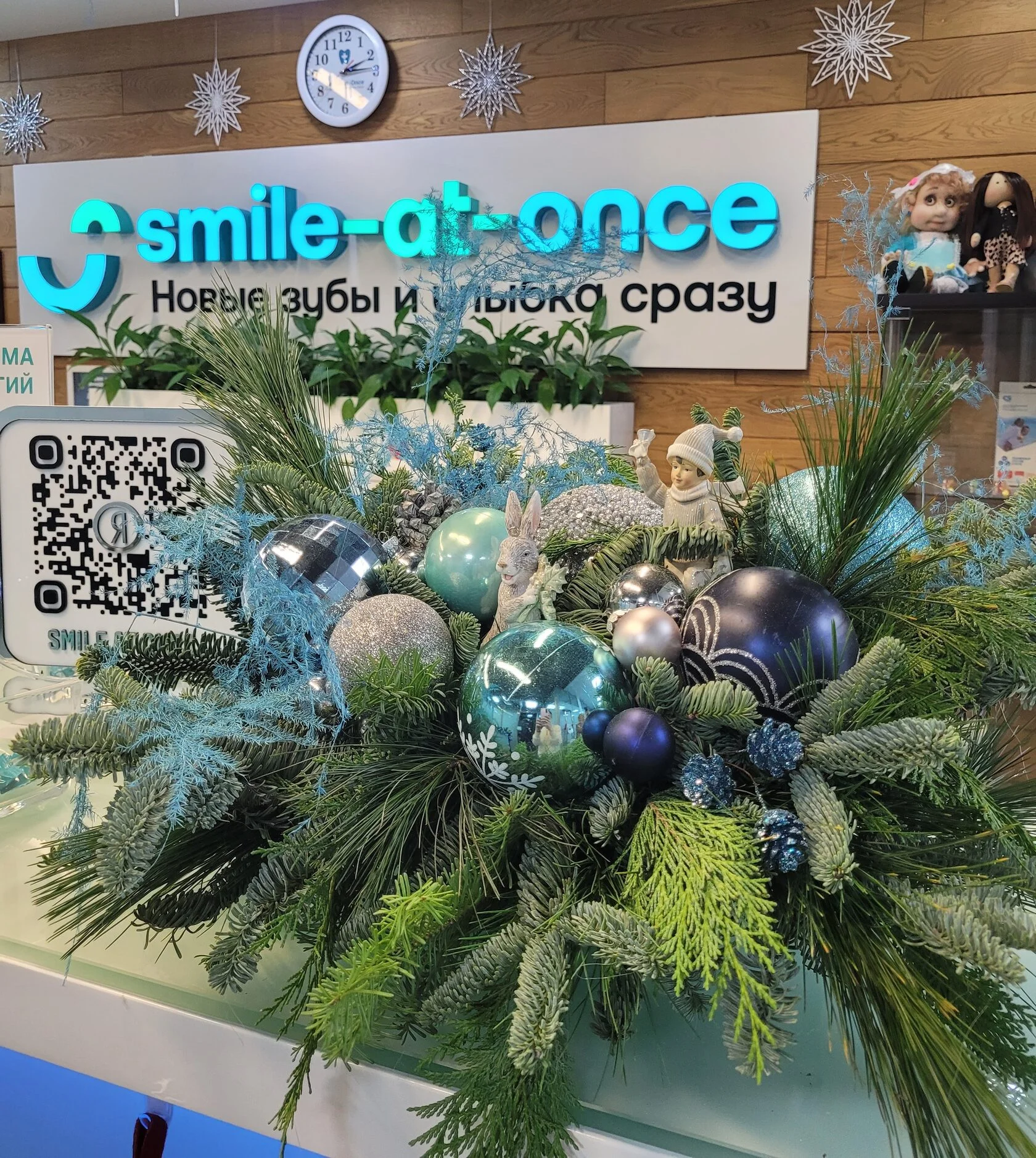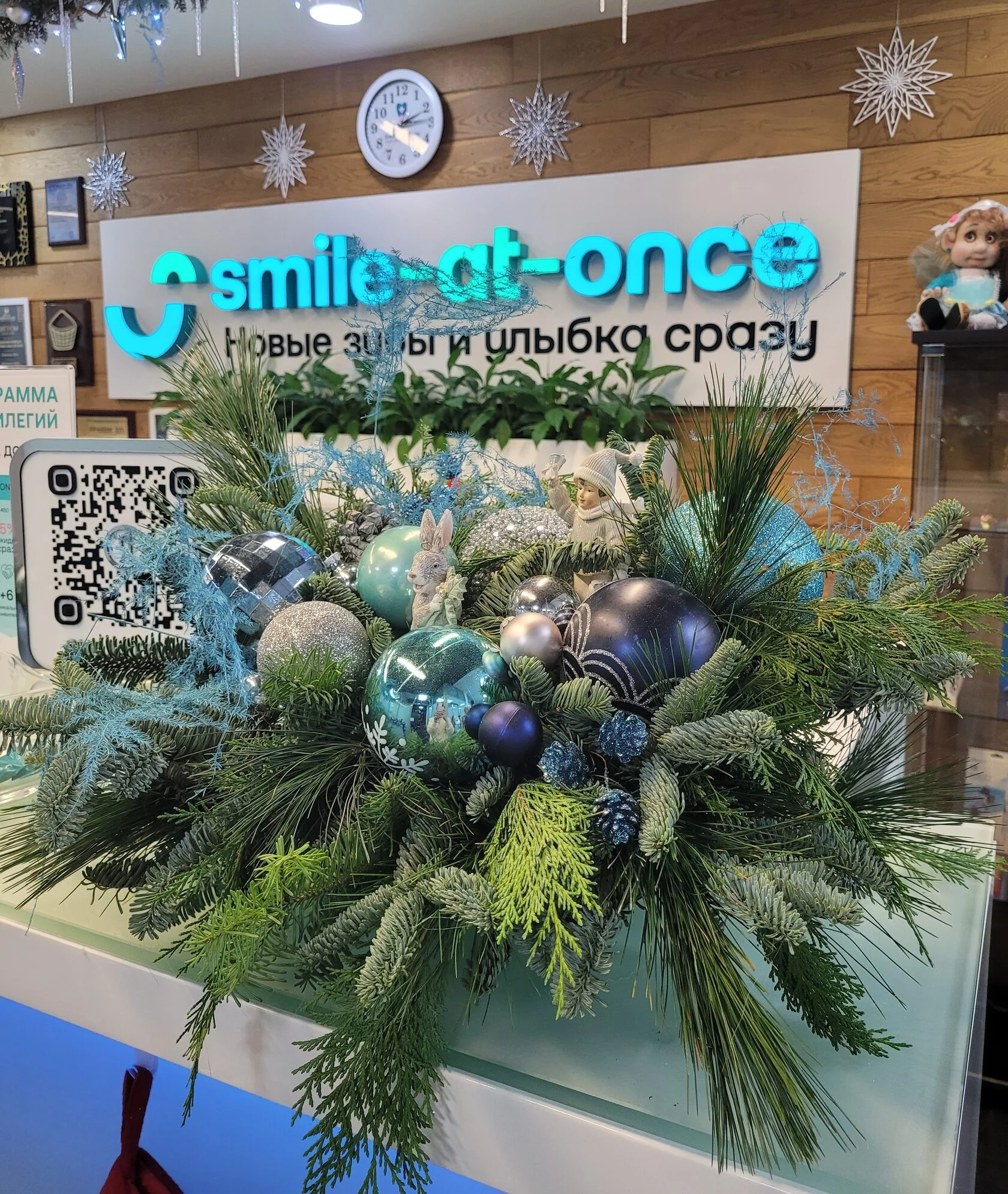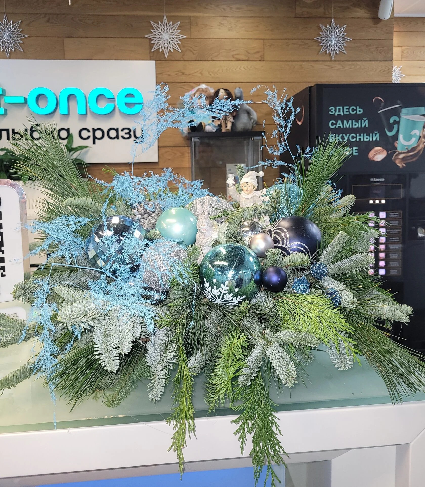 Композиция включает ветки хвойных деревьев, украшенные шарами и декоративными элементами. Шарики переливаются голубым, серебристым и темно-синим цветами. Среди украшений выделяется фигурка маленького человечка.