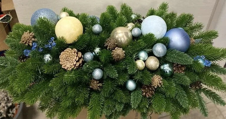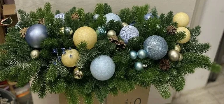Еловая композиция для Нового года выполнена из натуральных веток и декорирована шарами и шишками. Шарики переливаются разнообразными оттенками: голубыми, золотыми и серебряными. В центре композиции — искусственная хвоя высочайшего качества, которая имитирует заснеженные ветки.