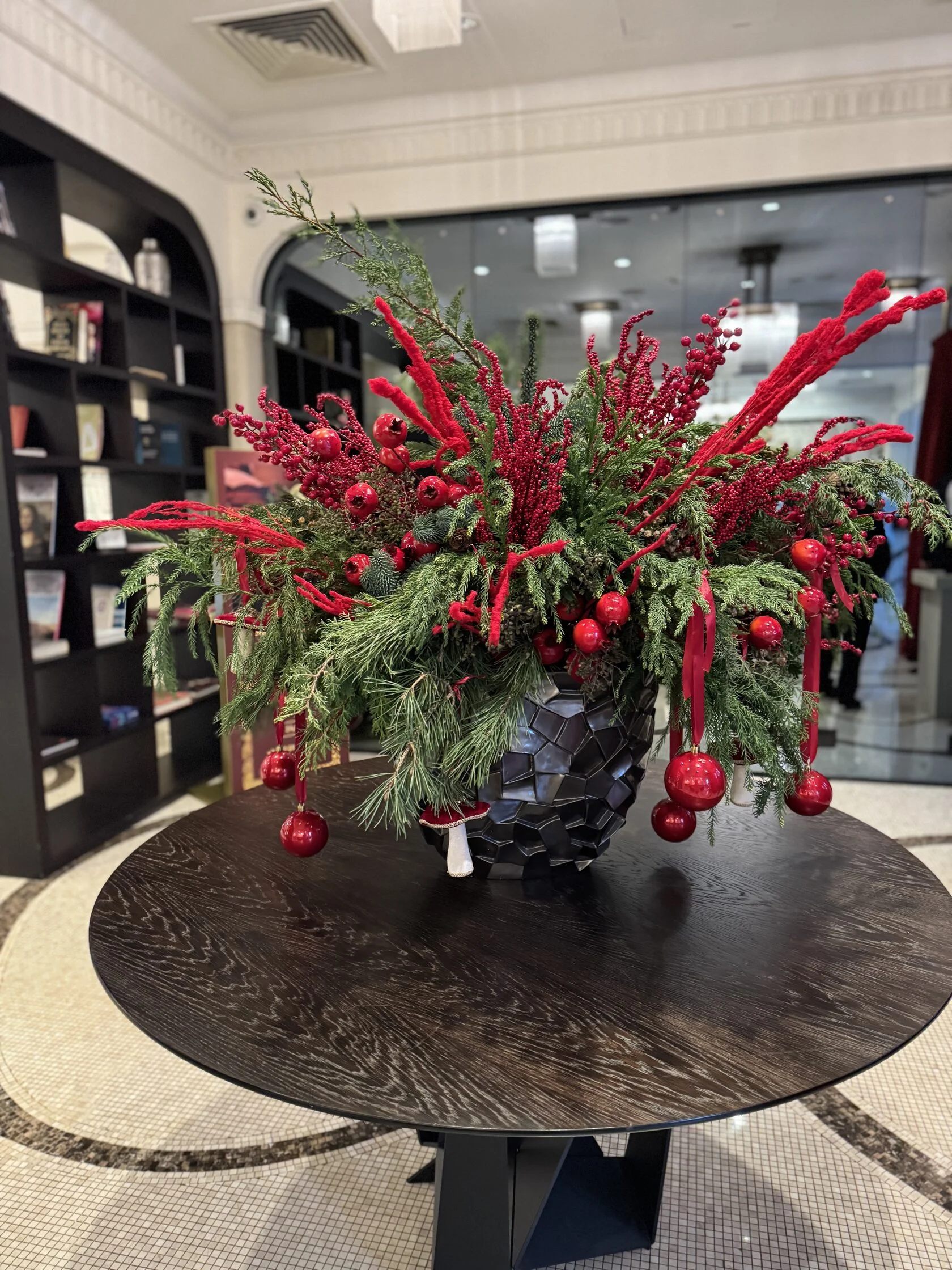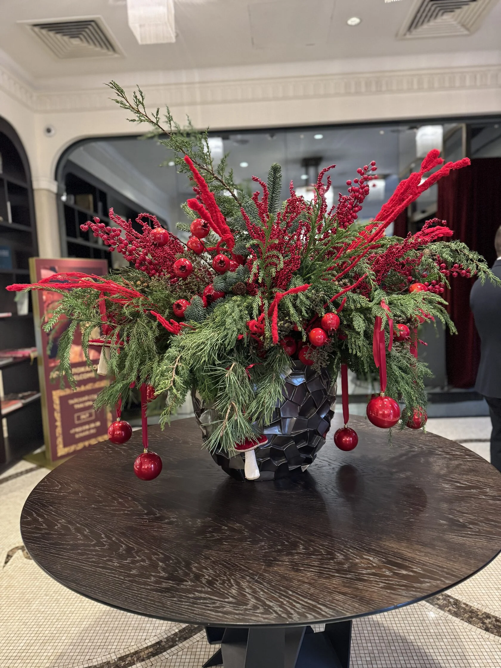 Эта композиция предназначена для тех, кто по-настоящему ценит атмосферу праздника. Густые ветви живой хвои, источающие аромат зимнего леса, создают изысканный фон для благородного бордово-красного декора. Бархатистые, металлические и матовые текстуры переливаются светом и тенью, придавая пространству драматизм и ожидание волшебства.