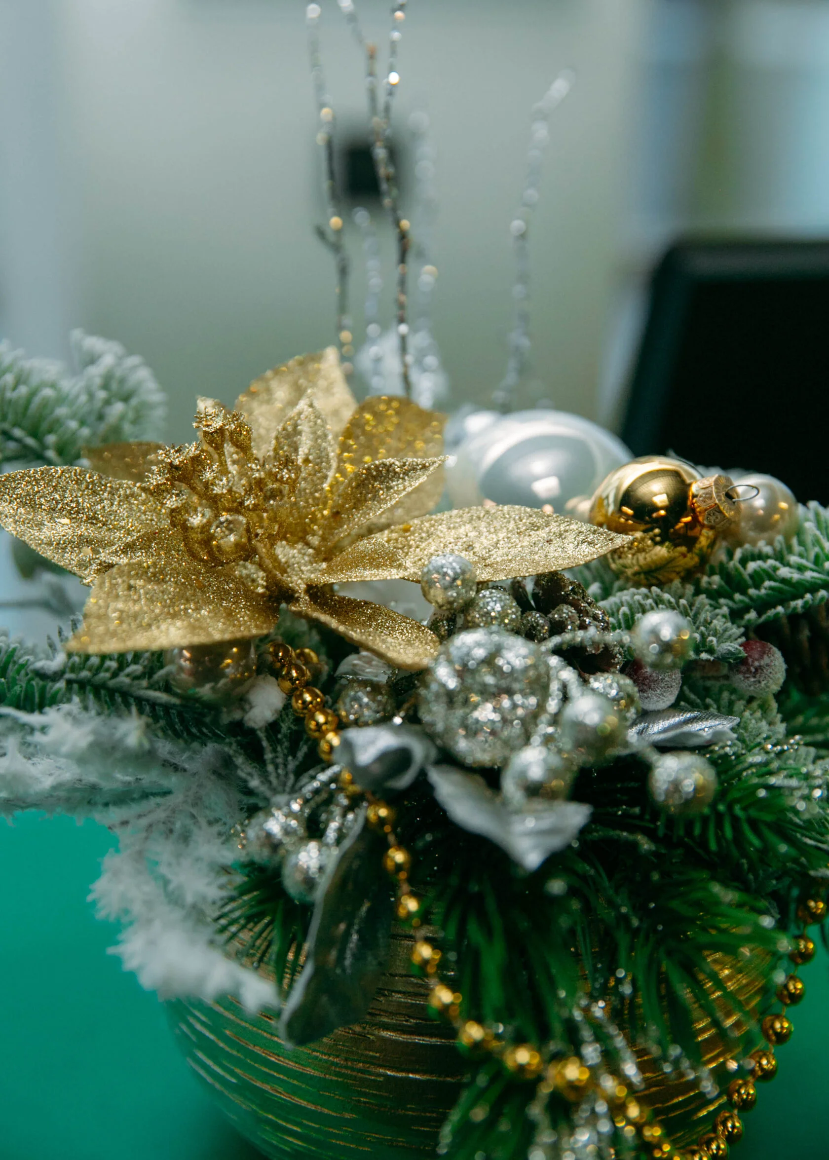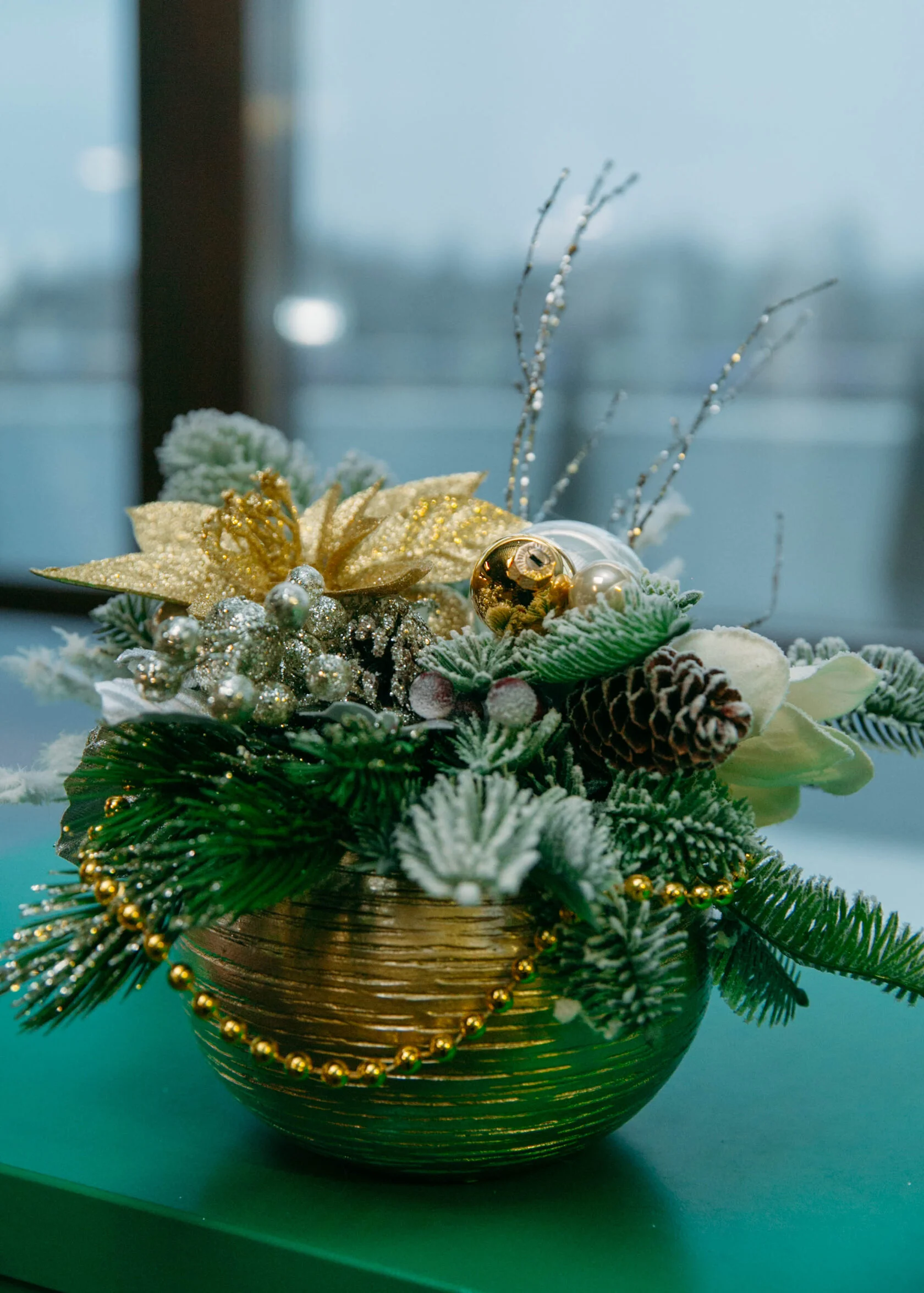 Новогодняя композиция в золотистой вазе. Веточки искусственной ели украшены белым «снегом». В композиции есть золотистые и серебристые элементы: блестящие шары, цветы, шишки, веточки с блёстками. Вазу обвивает золотистая гирлянда из бусин.