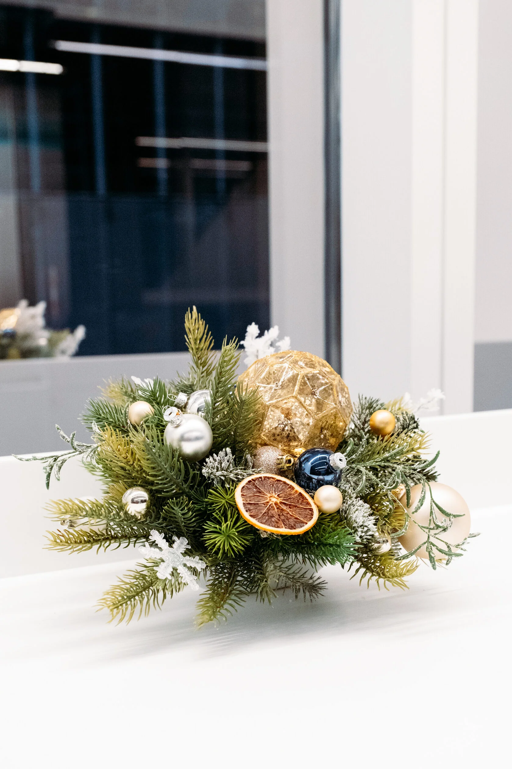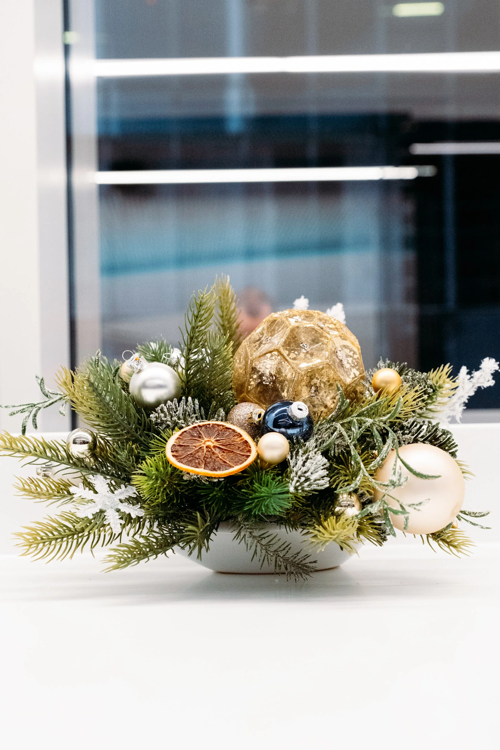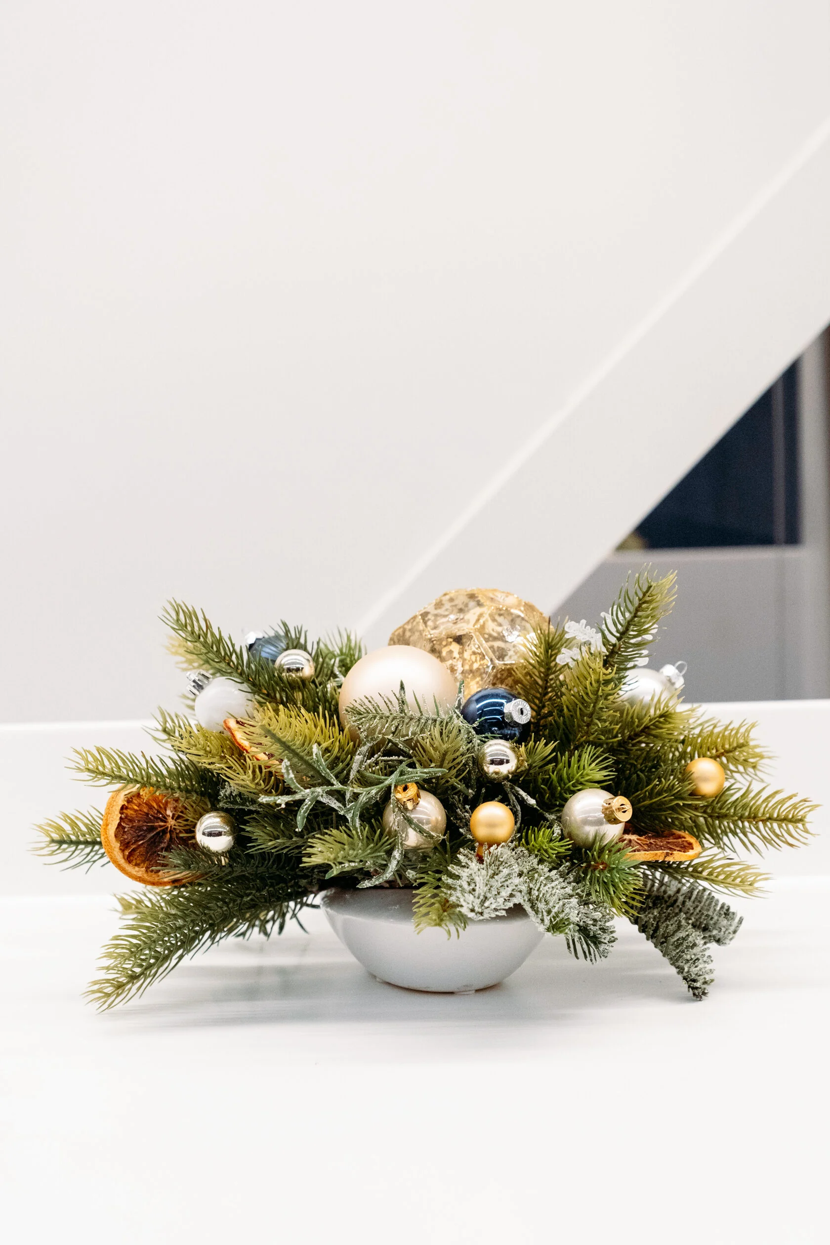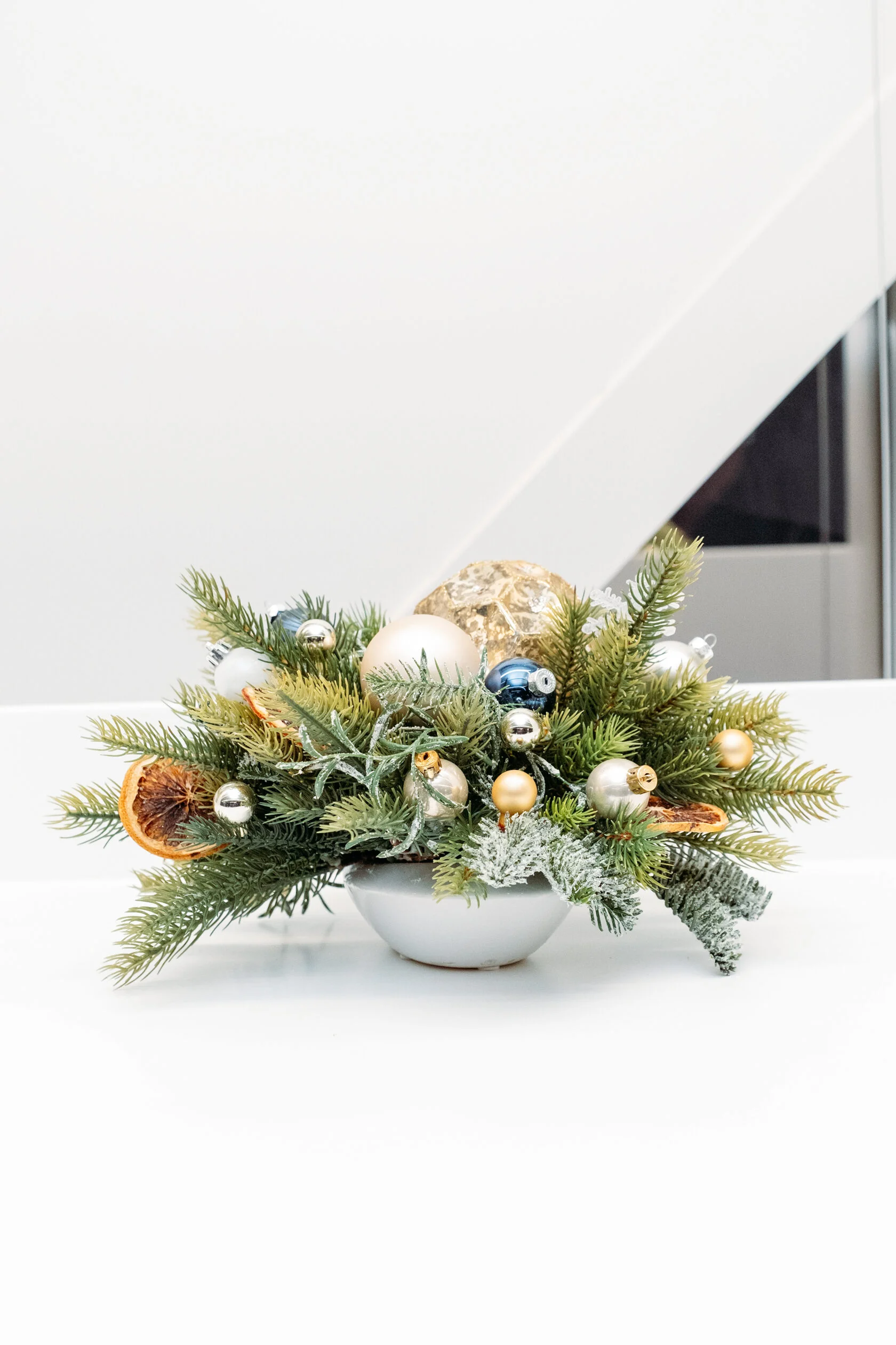 Новогодняя композиция в белой вазе сразу привлекает внимание. В центре — ветви ели, украшенные изысканными элементами: золотым шаром, серебристыми и золотистыми шариками, синим шаром и сушеным ломтиком апельсина. Белый искусственный снег на ветках создает атмосферу зимней сказки, добавляя волшебства.